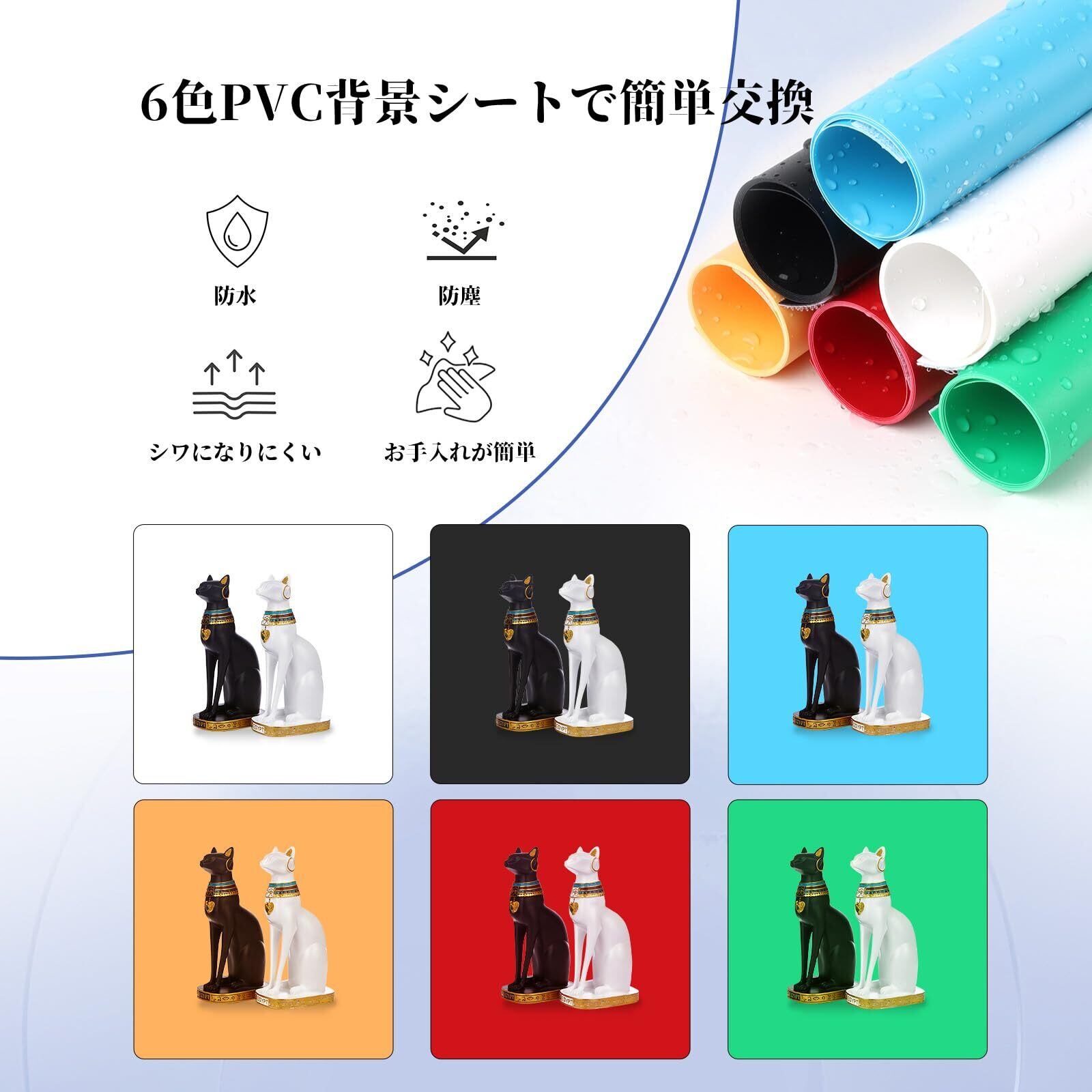 【多彩な6色背景シート】黒・白・青・赤・緑・オレンジの6色PVC背景シートが付属します。防水・汚れ防止加工が施されており、食品撮影などで汚してしまってもサッと拭けば清潔を保てます。背景を変えるだけで商品の印象を自在に演出できます。