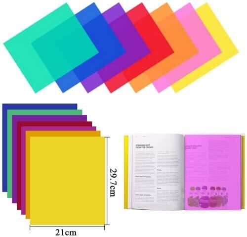 照明用カラーフィルター 7色ライティングフィルターセット 透明色補正 ライティングフィルムプラスチックシートフラッシュライティングゲルフィルターキット (29.7x21cm) (7枚)