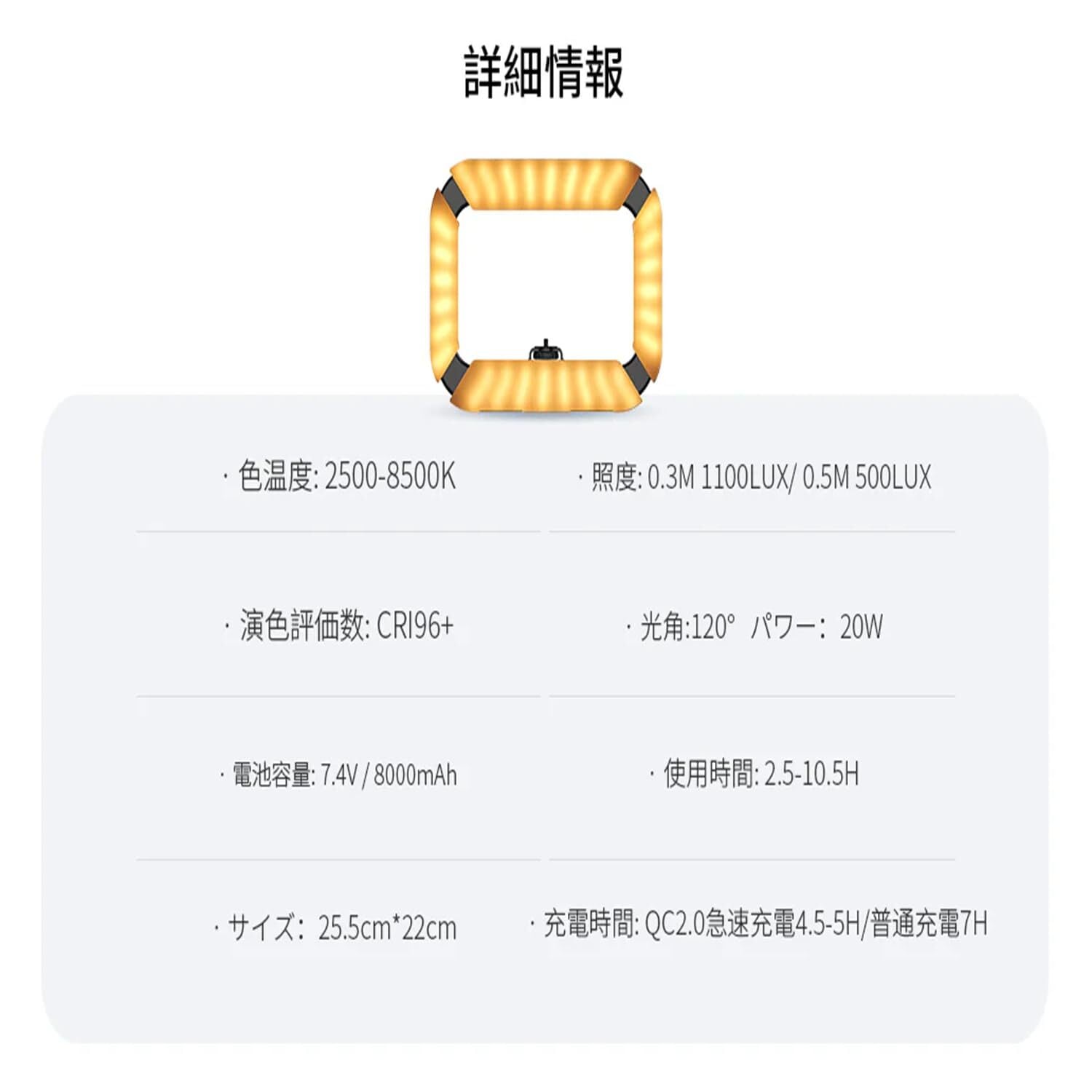 色温度を2500~8500Kの間で調整可能な200個のLEDをリング状に使用して、 光は柔らかく、スタンバイ時間は最大2.5時間です。