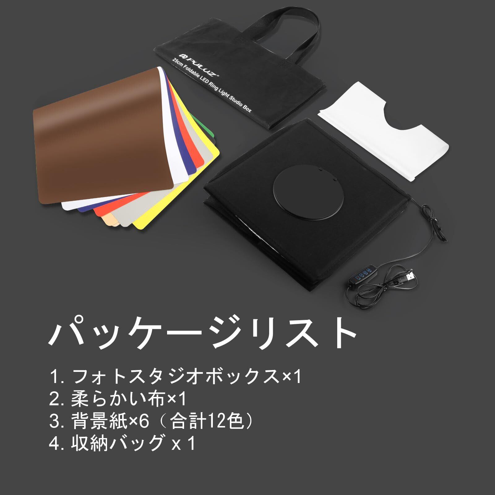 【両面背景6枚、12色】PULUZ 25cm 簡易撮影ボックス、取り外し可能な12色の背景シート6枚(黒/白/灰色/金/黄/オレンジ/赤/ピンク/青/紫/緑/茶)が付属しています。 柔らかい布を装備しているため、反射率の高い製品の撮影や高露出の低減に適しています。 背景色を簡単に変更し、ニーズに合わせてさまざまな撮影シーンを構築できます。