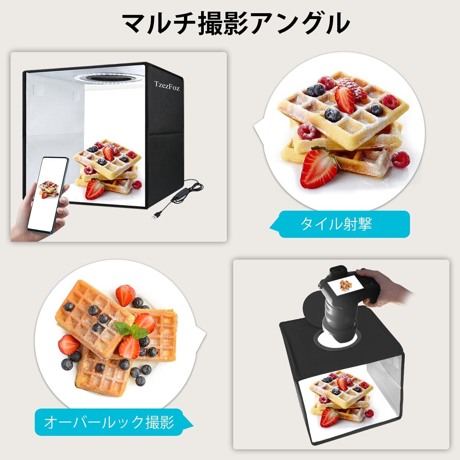 この撮影スタジオは120個のLEDを内蔵し、均一な照明を提供し、影、グレア、反射を最小限に抑えます。