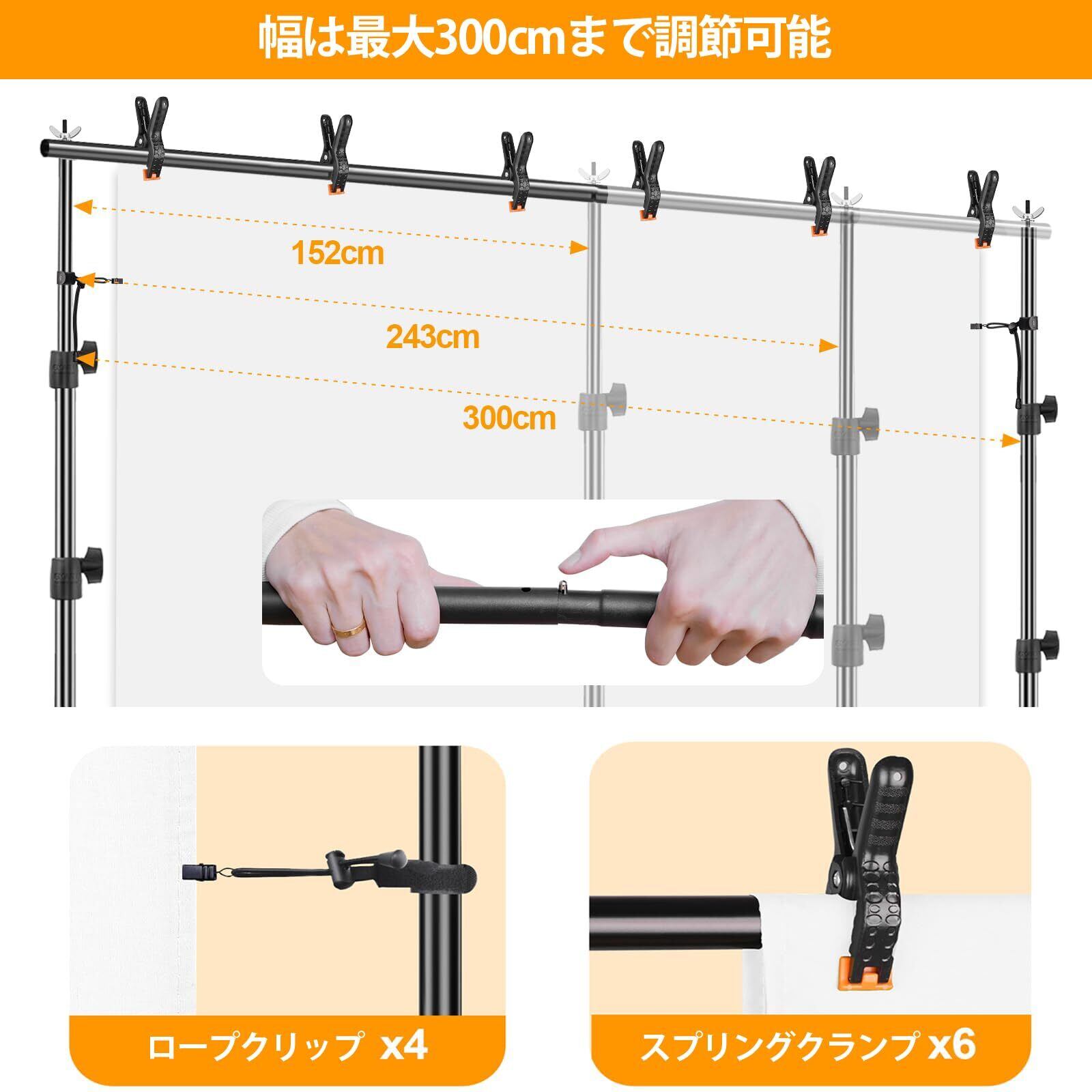 【豊かなアクセサリ付き】❶スプリングクランプ&ロープクリップが背景布、背景紙、暗幕やクロマキースクリーンなどしっかりと背景布スタンドに固定され、脱落することが絶対に起こらりません。背景布をしっかり伸ばして固定し、シワを減らす。❷高い場合や吊り下げられた物体が重い場合にも不安定になる可能性がありますが、ナイロン製のサンドバックを使用すると、底部の重量が増加し、背景スタンドの安定性が向上します。)❸ キャリーバッグはプレミアム品質のナイロン素材で、持ち運びやコンパクト収納に便利なバッグです。)