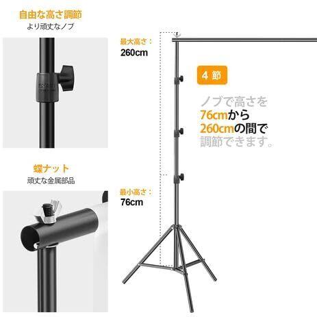【サイズ調節可能】アルミ合金製を採用し、頑丈で耐久性があるだけでなく、軽量の設計で持ち運びも簡単です。一人でも楽に組み立てや分解可能。また、腐食や錆びなどが発生しにくいという特徴があります。調整範囲:高さ91cm-260cm、幅の調整はできません。(ご注意:背景布が含まれない。)