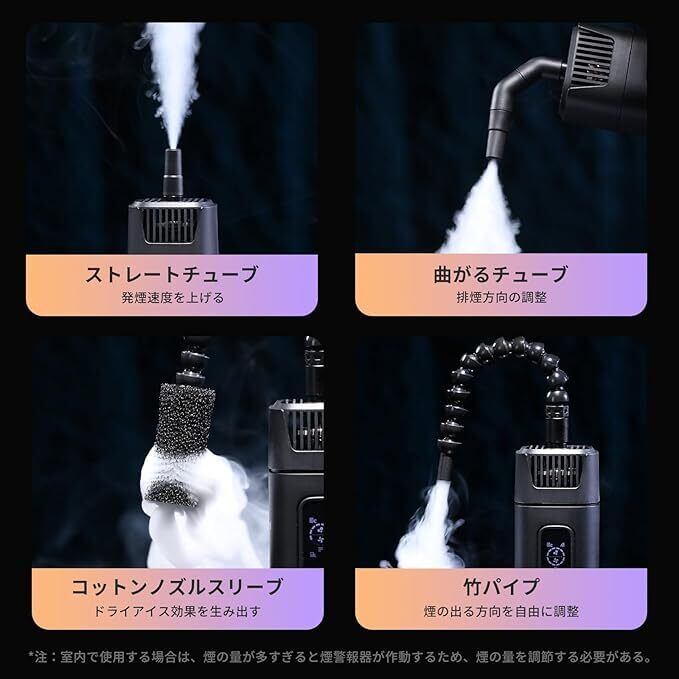 【マルチユース・シナリオ対応】フォグマシンは、強度と速度の組み合わせで全36種類のフォグ効果から選択可能。高圧ノズルにより、煙を狙った位置に正確に噴出できます。以下の付属品により、多様な煙演出が可能です:1.ストレートチューブ:煙の噴出を加速、2.エルボーチューブ:噴射方向を自在に調整、3.スポンジフィルター:ドライアイスのような低煙効果を演出、4.竹パイプ:煙の出る方向を自由にカスタマイズ。