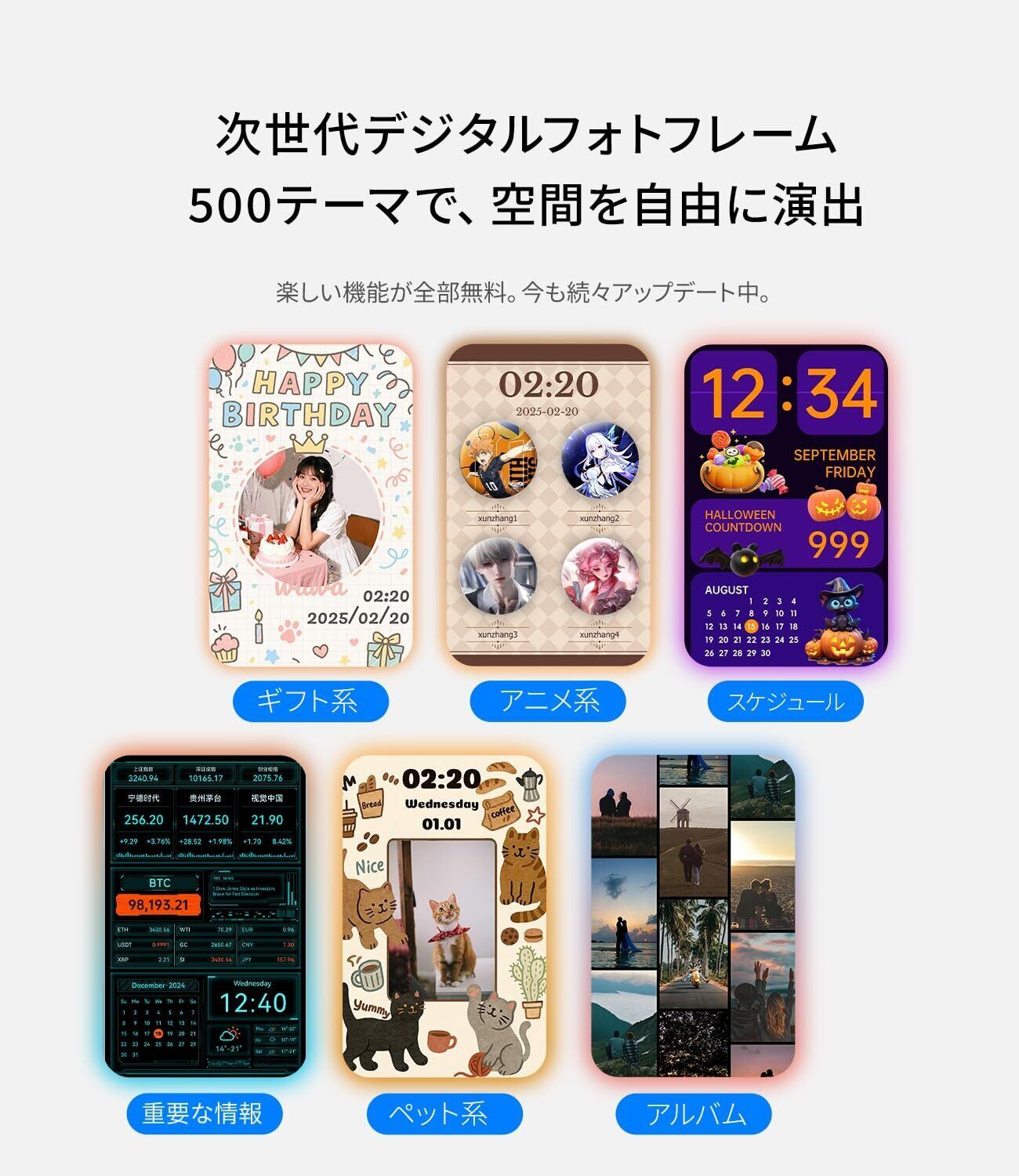 【500以上のテーマ】アルバム、カレンダー、時計、天気予報、マーケット情報、ピクセルアートアニメーション、アーティストコラボ、祝日・記念日テーマ、ゲーム、スポーツ、SNS通知、DIYカスタムなど、500以上の豊富なシステムテーマを搭載。毎月新しいテーマを追加。スケジュールに合わせた自動切替や、ロータリーノブで素早くテーマを変更できます。