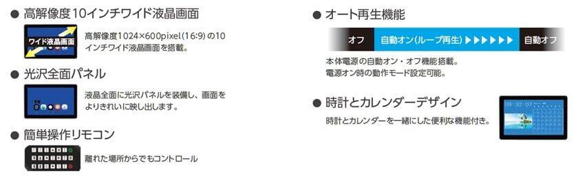 ●カラー:ツートン(表:ブラック/側面・背面:ホワイト) ●液晶画面サイズ:10インチワイドTFT液晶 ●実エリア表示サイズ:約222.7×125.28mm ●解像度:1024×600ピクセル ●輝度:250cd/m2 ●コントラスト比:500:1(Typ.) ●アスペクト比:16:9 ●視野角:左右140度、上下130度 ●メモリーカードスロット:SD/USBメモリ 最大16GBまで ●スライドショー再生:16パターン(ランダム含む) ●スライド間隔:3/5/15秒 1/5/15/30分 1時間 ●対応ファイル 【写真】JPEG ,BMP,GIF,PNG 【動画】:MOV,MPG,AVI,MP4 【音楽】:MP3,WMA,WAV ●対応言語:日本語,英語 ●消費電力:約7.5W(最大) ●動作温度範囲:0℃~45℃ ●動作湿度範囲:90%RH以下(結露なきこと) ●外形寸法:約W248×H163×D25mm(スタンド部を除く) ●質量:約428g(ACアダプターを除く)