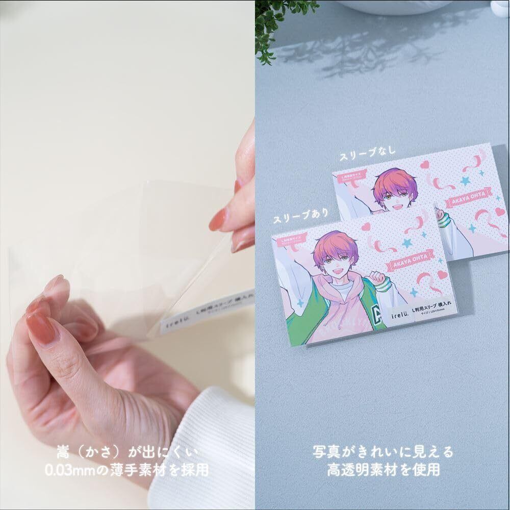 【推し活収納系インフルエンサー『mico』監修】L判写真用の横入れタイプの高透明保護スリーブ。スリーブの開口部を広く設計した横入れタイプなので、L判写真をスムーズに差し込めるのが特長です。サイズはL判写真ぴったりに調整されており、アルバムに収納した際に美しく見えるように設計されています。さらに嵩(かさ)が出にくい0.03mmの薄手素材を採用し、また写真の色彩や細部の美しさを損なわない高透明素材を使用しています。イレール アルバムリフィル6ポケット(両面) L判・ヨコ/タテと組み合わせれば、スリーブサイズの心配なく安心してアルバムに収納できます。
