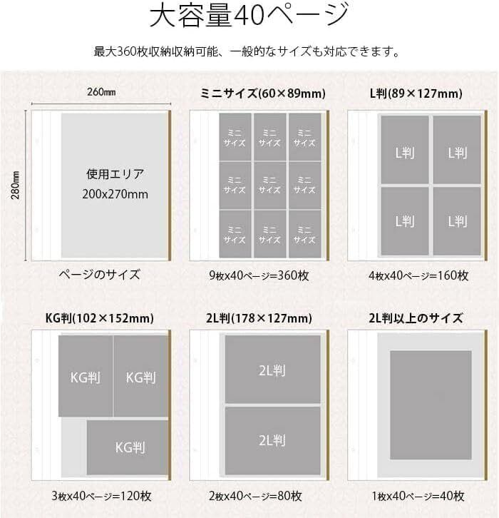 【大容量写真収納】40ページ360枚、480枚を任意に選択できます。家族の思い出をまとめて整理できる、ファミリーアルバムです。いろいろなサイズの写真が入るため、大切な思い出を1冊にまとめるのに便利。
