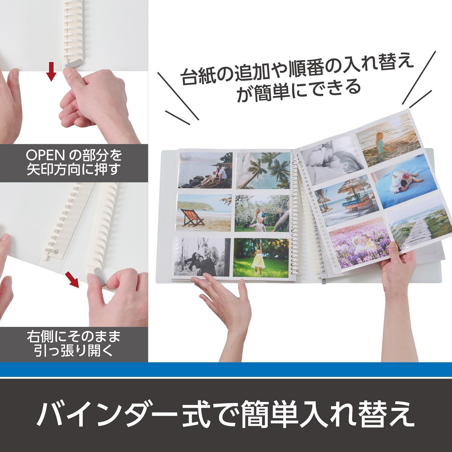 台紙を差し替え可能なバインダー式の写真収納ファイル。Lサイズ用台紙10シート入り(1シートあたり、両面合わせて12枚の写真を収納できます)。