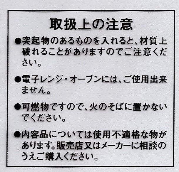 ●誤飲や窒息等事故につながる危険性がありますので、必ず小さなお子様の手の届かない場所に保管して下さい。●袋の角に注意して下さい。袋の角で怪我をされないように注意して下さい。●直射日光・高温多湿を避けて屋内で保管して下さい。保管状態によって製品が劣化し、変色やラミネートの剥離等事故につながる可能性があります。