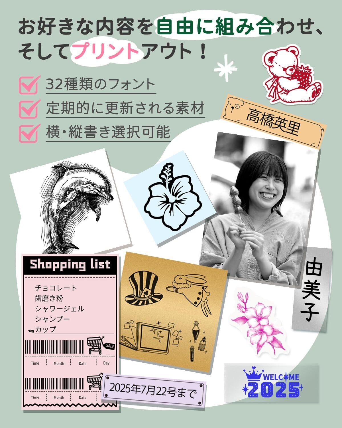 [多サイズ対応]M02S スマホプリンターは15mm・25mm・53mm の感熱紙とテープに対応し、用途を幅広くカバーします。学習ノート、フラッシュカード、図形図の印刷はもちろん、整理収納用ラベル、手帳装飾、年賀状、はがき、家計簿、オフィス文書など、日常のさまざまな場面で活用できます。約 40 カラーの感熱ロール紙から選べ、オリジナルステッカーを作れます