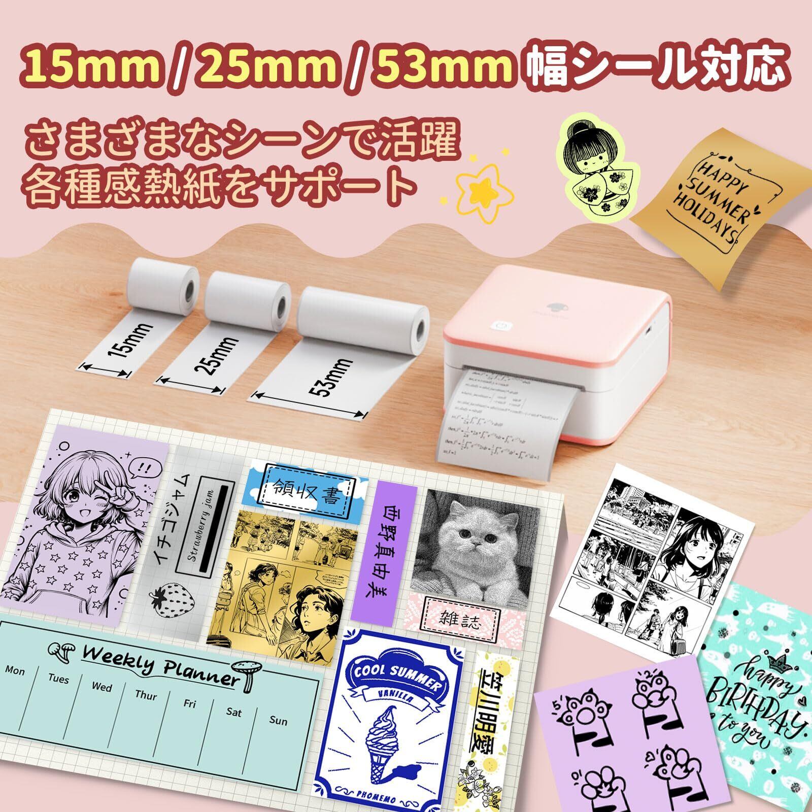 【53mm写真印刷&15/25mmテープ印刷のマルチ対応】本ステッカープリンターは53mmの写真印刷はもちろん、整理収納に便利な25mmと15mmのテープ印刷にも対応。ラベルボックステンプレートを使えば、場所や用途に合わせて自由にデザインを選べます。さらに約40種類以上の感熱ロール紙に対応し、白・カラー・透明・のり付きなど、目的に応じて用紙を選べる楽しさも魅力です。
