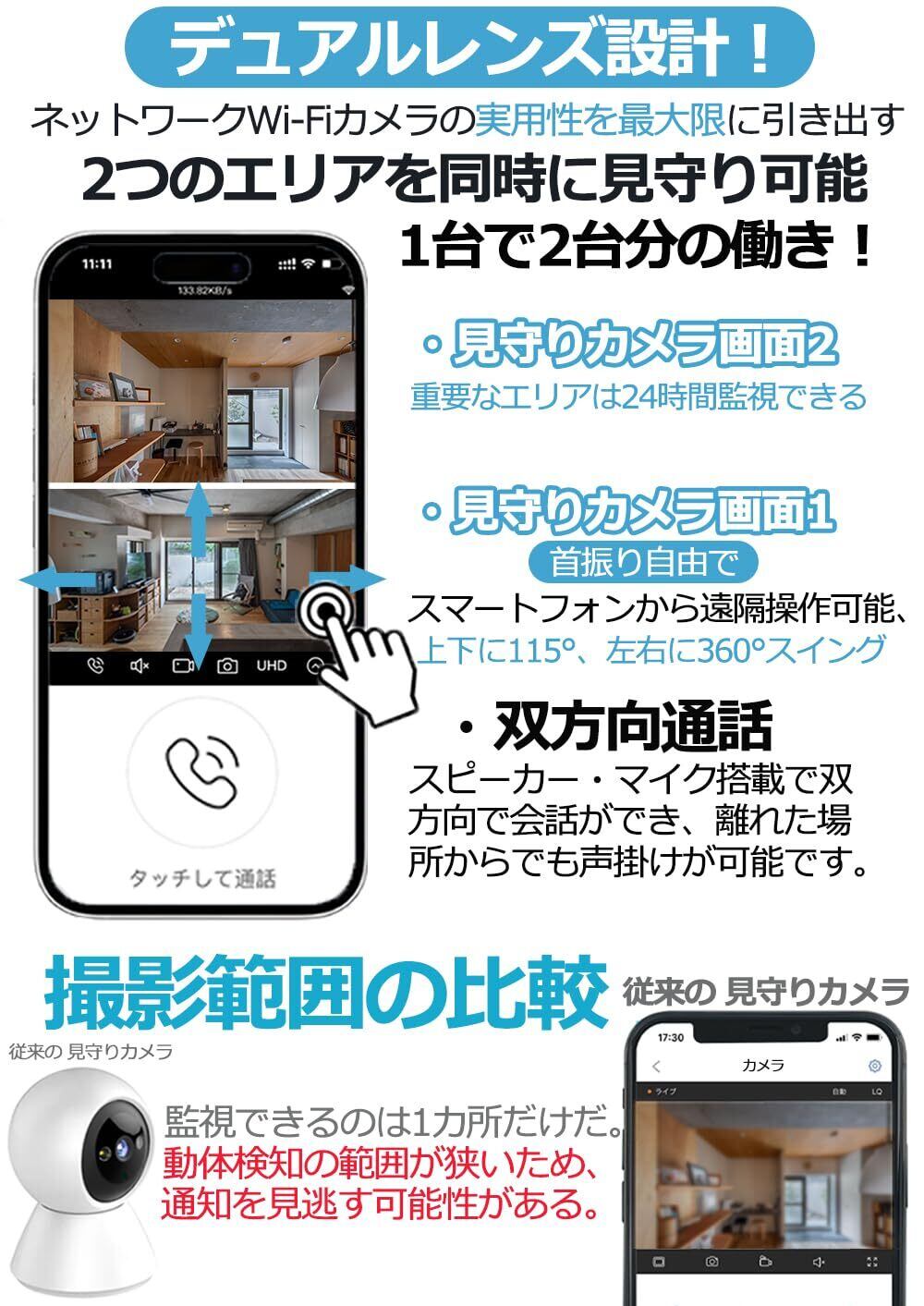 【2-in-1・見守りカメラ】:1台の見守りカメラで2カ所を同時に見守りことができる。監視カメラ画面1、スマートフォンから遠隔操作可能、上下115°と左右360°の首振りが可能で!監視カメラ画面2、90°の広視野角で固定撮影!お子様やペットの見守りに最適。