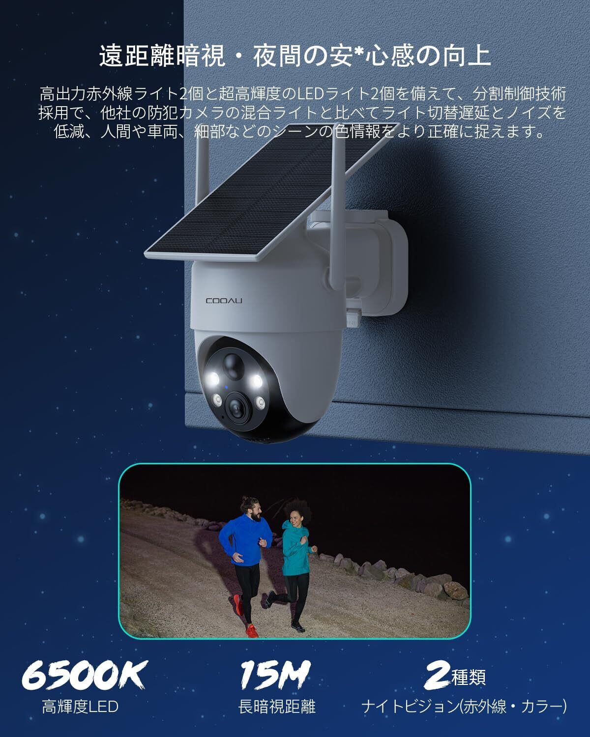 【新高効率太陽光発電モジュール●取付簡素化●外部5DBIアンテナ】 最新のBC技術を採用しており、光を効率的に吸収できるよう設計されています。晴天だけではなく、曇りの日や朝夕時などでもしっかり発電できます。従来のソーラーパネルより二倍可発電時間増加します。また3Mパネル接続用ケーブルがなくて、内部抵抗が低く、伝送のエネルギー損失が削減され、高効率充電を実現します。大容量バッテリーが内蔵されているWi-Fi通信式の屋外カメラなので、面倒な配線工事不要で取付け業者への依頼の必要がなく、どこでも気軽に設置できます。カメラとソーラーパネルは一体型なので、別途ソーラーパネルの設置工事と時間を省略して、分離型より簡素化!強力な5DBIアンテナを備え、高い電波貫通性能と耐干渉性能により長距離のデータ転送を実現します。玄関、カーポート、庭などルーターから離れた場所でもより安定したスムーズな映像を楽しむことができます。*設置環境に太陽光が当たらないので十分な電力を受けられていない場合は、の公式メールアドレスまでご連絡して、外付けソーラーパネルの無料を送付いたします。