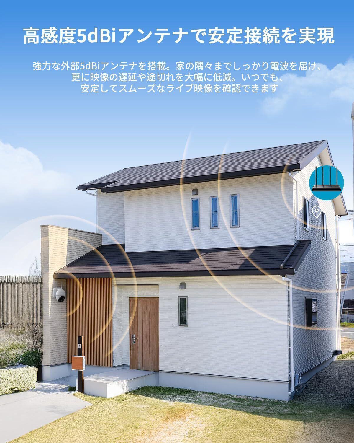 【9000mAhバッテリ・5Wソーラーパネル・5dBi高感度アンテナ】お客様の望みに応じて電力供給と通信品質をさらに進化させた。9000mAhの大容量バッテリーで、AOV録画・自動追尾・AI検知など、多彩な機能を余裕で安定稼働。5W高出力ソーラーパネルがで充電の手間ゼロ。更に2Wパネルの約2.5倍という高い発電効率で太陽に任せて、ほったらかしでもOK。外出・旅行中の電池切れ不安から解放される。さらに5dBiアンテナを搭載、Wi-Fi電波を従来比150%以上捕捉でき、離れた物置や広い庭など、電波が届きにくい環境でも、高精細なライブ映像を安定配信する。