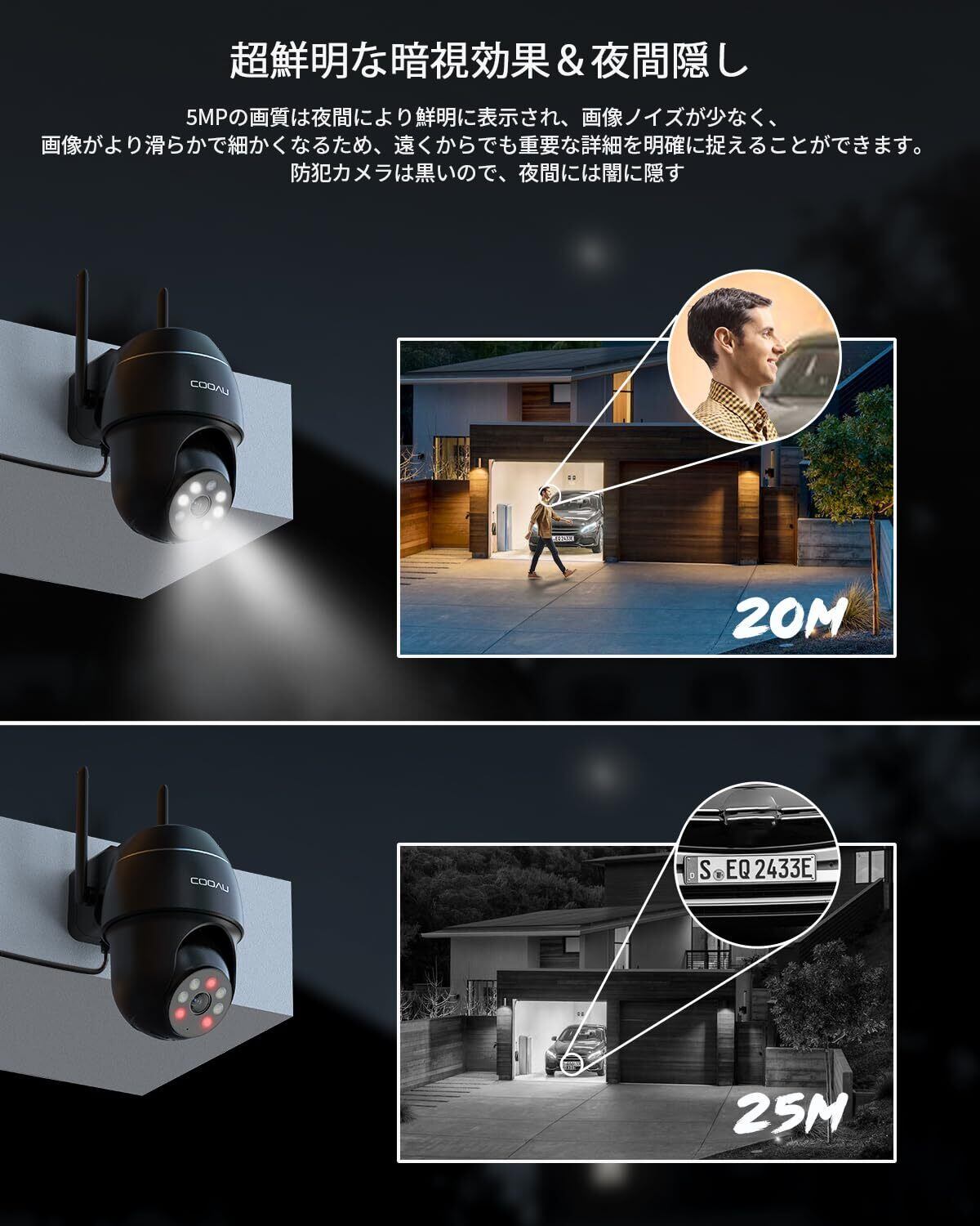 COOAU防犯カメラ屋外500万画素多検知エリア設定人 体検知人体追跡監視カメラWiFi/ワイヤレススマホ対応声光警報ネットワークカメ ラダブル5dBiアンテナ常時録画カラー夜間撮影屋外カメラ双方向音声家族共有 防犯カメラ屋外ランキングIP66防水PTZカメラH.265データ圧縮技術マイクロ SDカード/クラウド iOS/Android対応Alexa対応