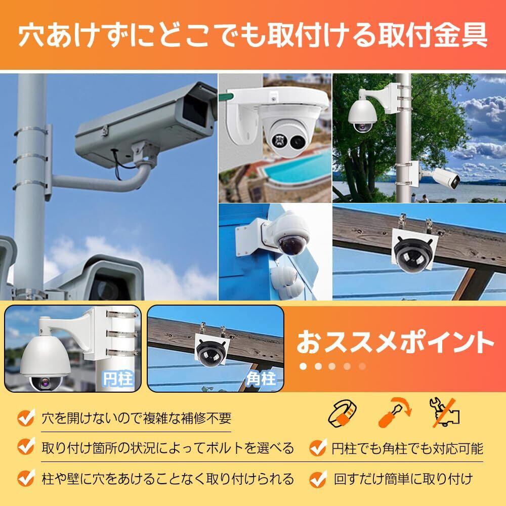 防犯カメラ 取り付け金具 ポール ブラケット スタンド ハウジング カメラ 穴開け不要 監視カメラ 円柱 角柱 ダミーカメラ 取り付け簡易 空き巣 対策 ボルト 防犯ステッカー2枚 付属 穴あけず バンドサイズ直径10cm /20cm 各2本 (ホワイト)