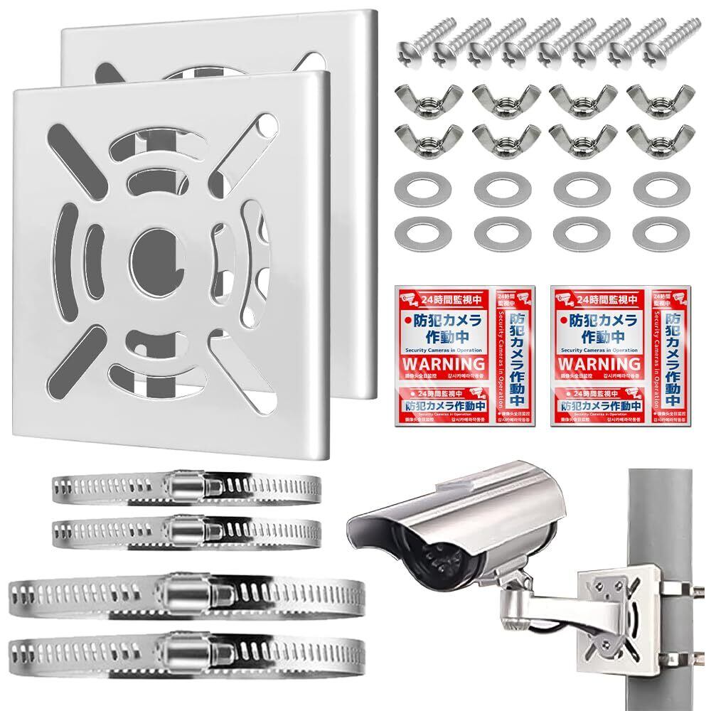 【セット内容】:カメラ ブラケット スタンド(取付金具)x2、ステンレスバンド4本(サイズ直径:100mm/200mm各2本)、M4ステンレスボルト8セット(M4x22mm)、ステンレス蝶ナットM4x8セット、ステンレスワッシャーx8セット(M4x12mmx1mm)、防犯ステッカー2枚(3種類)、日本語取扱説明書x1枚。適合の取り付ける環境:室内/室外にサポートします。