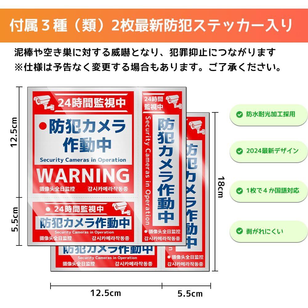 【防犯ステッカー2枚】セキュリティーステッカーの設置は、最も 「 手軽 」「 簡単 」「 安価 」 にできる防犯対策です。防犯ステッカーは侵入してくるであろう場所や窓や車窓、ドアなど防犯カメラが設置できない場所に貼り付けることができます。 防犯カメラと併用すると相乗効果があります。防水加工とお客様のお声を反映した厳選サイズ&デザインを採用し、離れたところからでも目立ちます。車外装用のシールと同じな素材を採用しておるので、色褪せしにくいです。付属の防犯ステッカー は、4ヵ国語(日本語・英語・中国語・韓国語)に対応します。グローバル犯罪にも抑止効果を発揮致します!仕様は予告なく変更する場合もあります。ご了承ください。