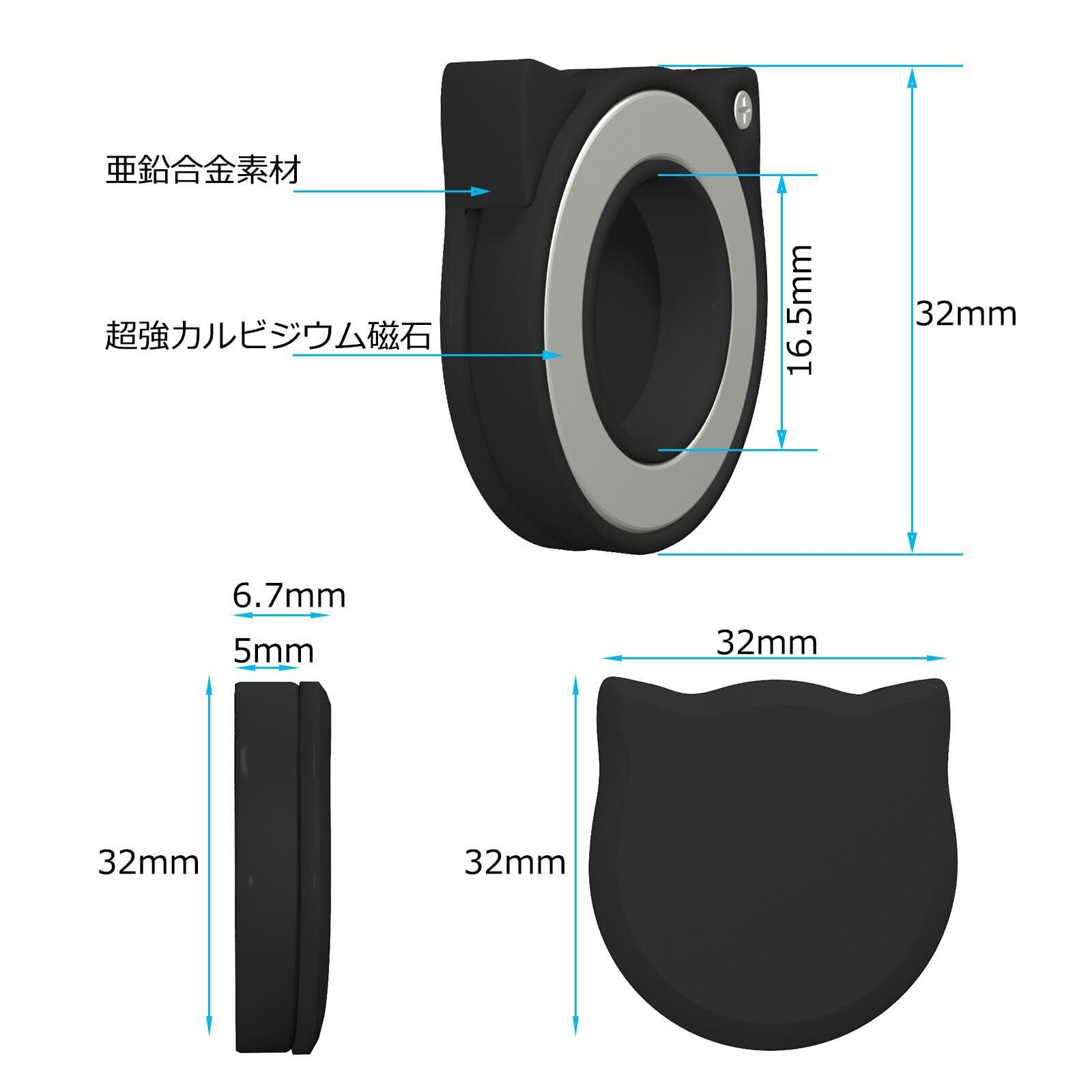 【寸法】:長さ32 mm、幅32mm、厚さ6.7 mm(カバー装着時)、重量約28g;適用直径16.5 mm、厚さ5 mm以下のドアミラーに取り付け可能;表面が平らで磁石が使用可能なスチール製ドアに取り付け可能(アルミニウム製または木製ドアには取り付け不可)。