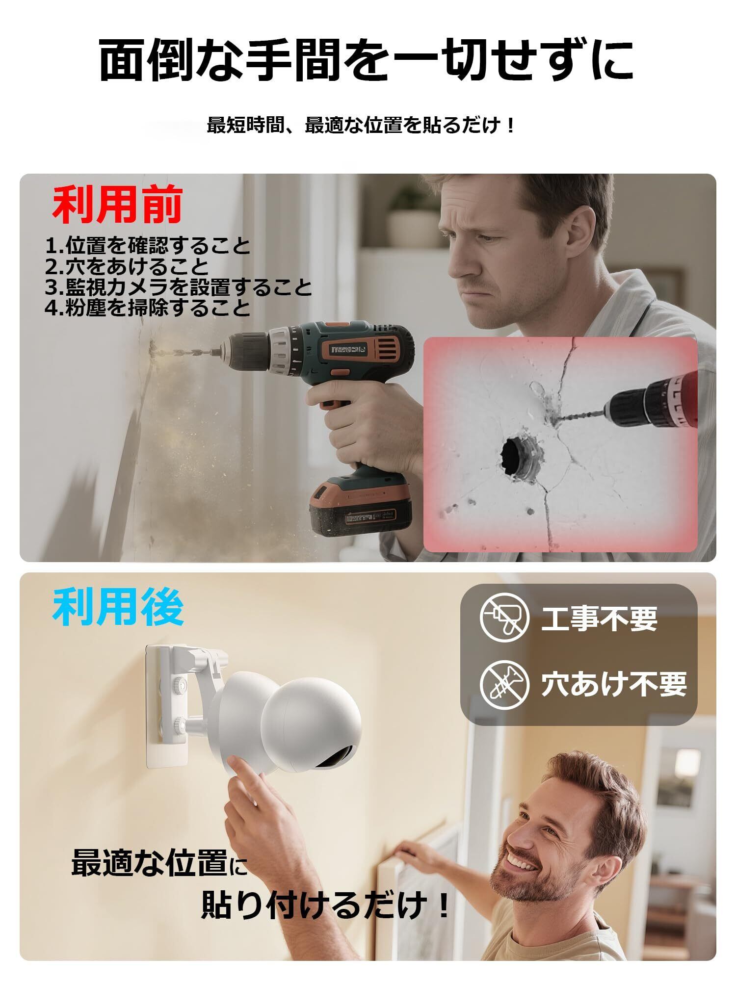 【取り付け手順】 1--取り付け位置を決める(カメラを設置したい場所を選び、表面のホコリや油分をきれいに拭き取ります。) 2--粘着パッドを貼り付ける(裏面の保護シートをはがし、選んだ場所にしっかりと貼り付けてください。) 3--24時間放置して粘着力を安定させる、、24時間経過後、付属の土台とカメラを組み立て、カメラを貼り付けた位置に取り付ける。