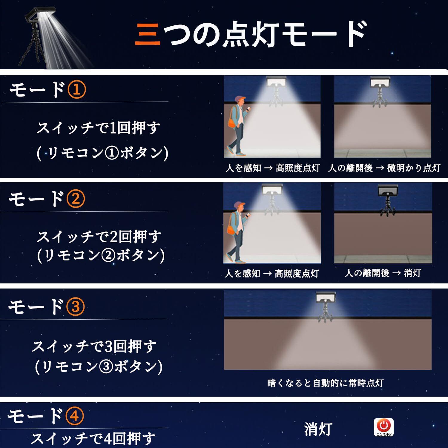 【リモコン操作・3モード切替・IP65防水仕様】付属リモコンで簡単に3つの智能モードを切替可能:①1押目:人感知で15秒高輝度→微光 ②2押目:人感知で15秒高輝度→消灯 ③3押目:微光常時点灯(人感知なし)④4押目:消灯。点灯中に5秒長押しで光色(白/暖/中性)を切替可能。IP65の最高等級防塵防水性能により、台風や大雨など厳しい環境下でも安心してお使いいただけます。