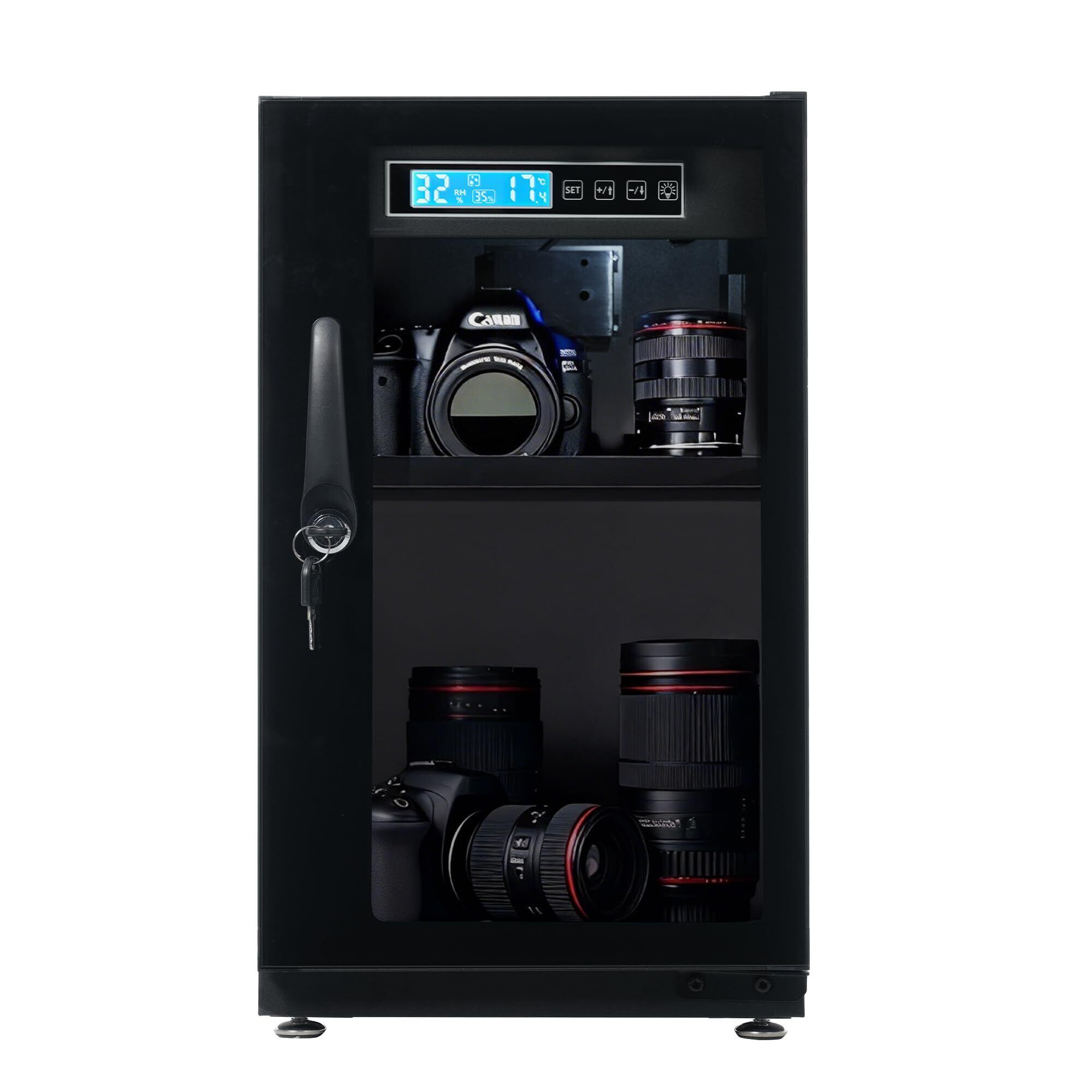 【鍵付き・静音設計で安心して使用可能】扉には鍵が付いており、大切な機材を安心して保管できます。また、動作音を抑えた静音設計のため、リビングや寝室、書斎などさまざまな場所で使用しやすく、生活空間に置いても気になりにくい仕様です。【ロックキー装備でセキュリティ対策も万全】 ロック機能付きなので、大切なカメラやレンズを子供のいたずらや盗難から守ります。