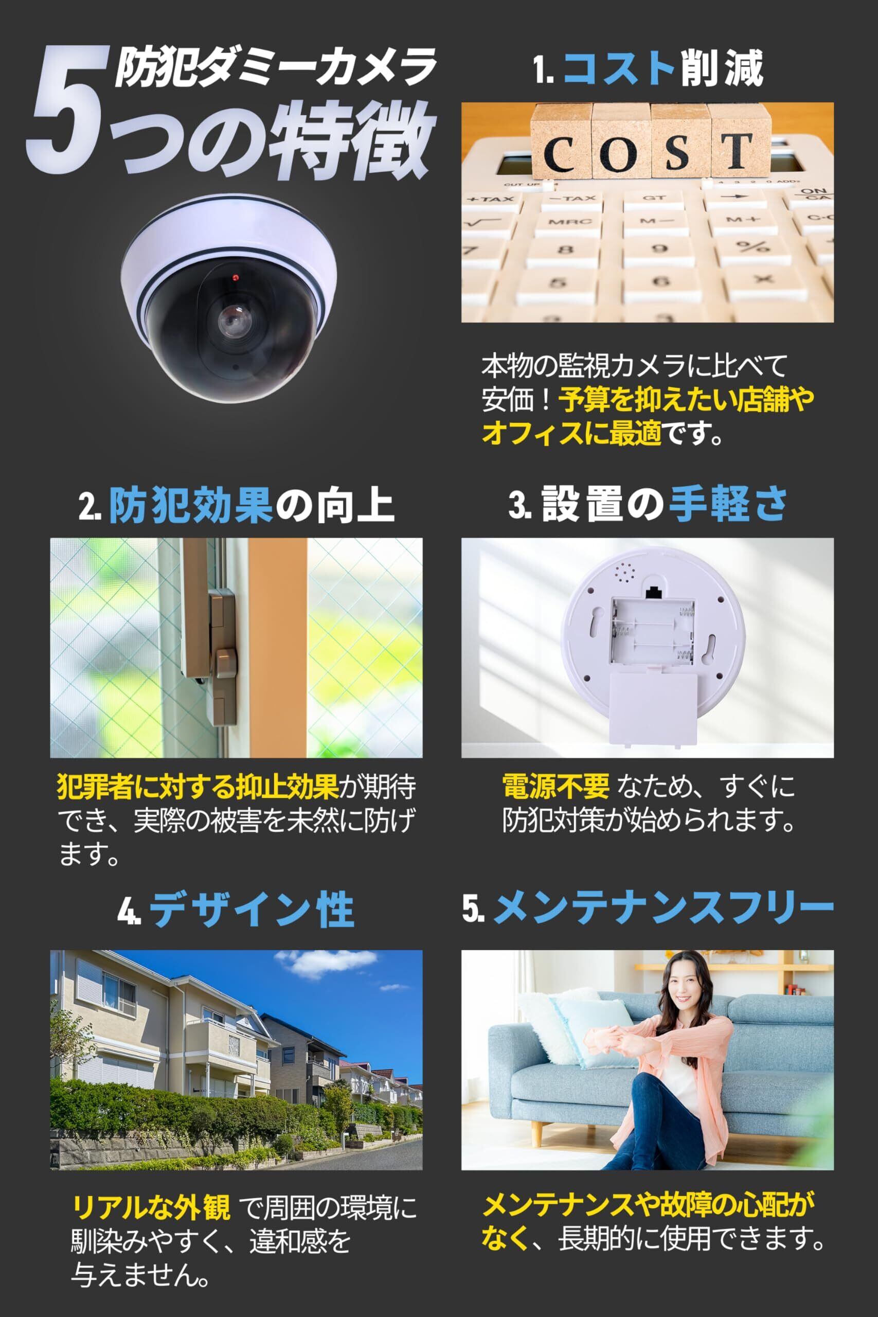 【コスパ抜群&簡単設置で手軽に防犯対策】本物そっくりのリアルなデザインで心理的な抑止力が期待できるダミー防犯カメラ。配線不要で設置場所を選ばず、初心者でも簡単に設置可能。コストを抑えつつ複数台設置で防犯力アップ。家族や財産を守るための頼れる防犯アイテムです。