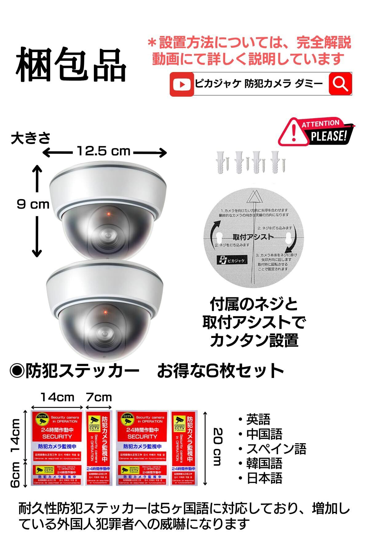 【セット内容】 : ◉ダミーカメラドーム型 大サイズ 2個 ◉取り付けアシスト ◉ネジ、コンクリートプラグ4本 ◉5ヶ国語対応 防犯ステッカー 2セット(3枚が1セット 21×20cm) ◉取扱説明書