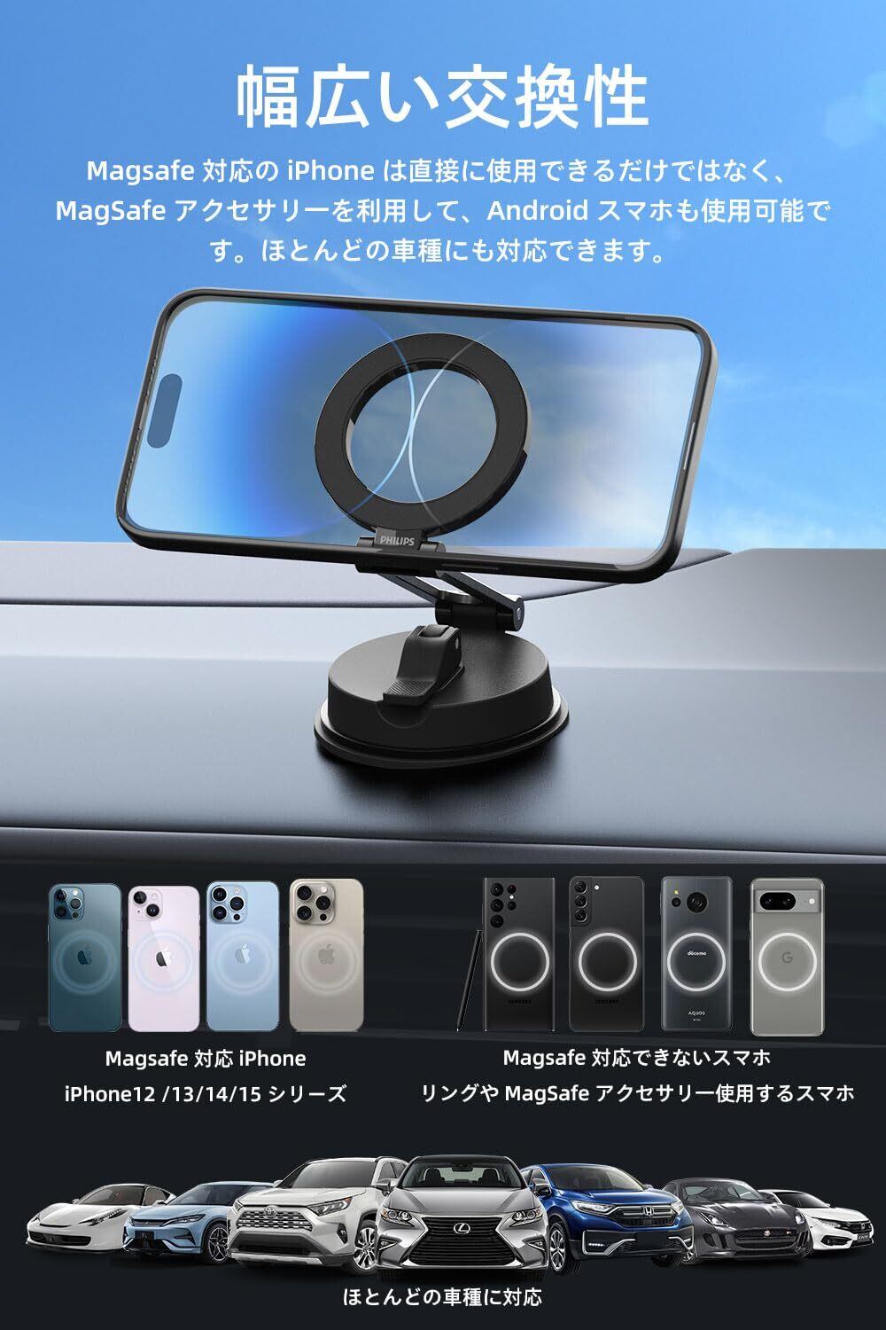 Philips (フィリップス) マグネット車載スマホホルダー magsafeホルダー 超強力吸着 真空吸盤 携帯ホルダー 多角度調整 360°回転な台座 車用ホルダー 折りたたみ式 片手操作 カー用品 全機種対応 DLK4131B