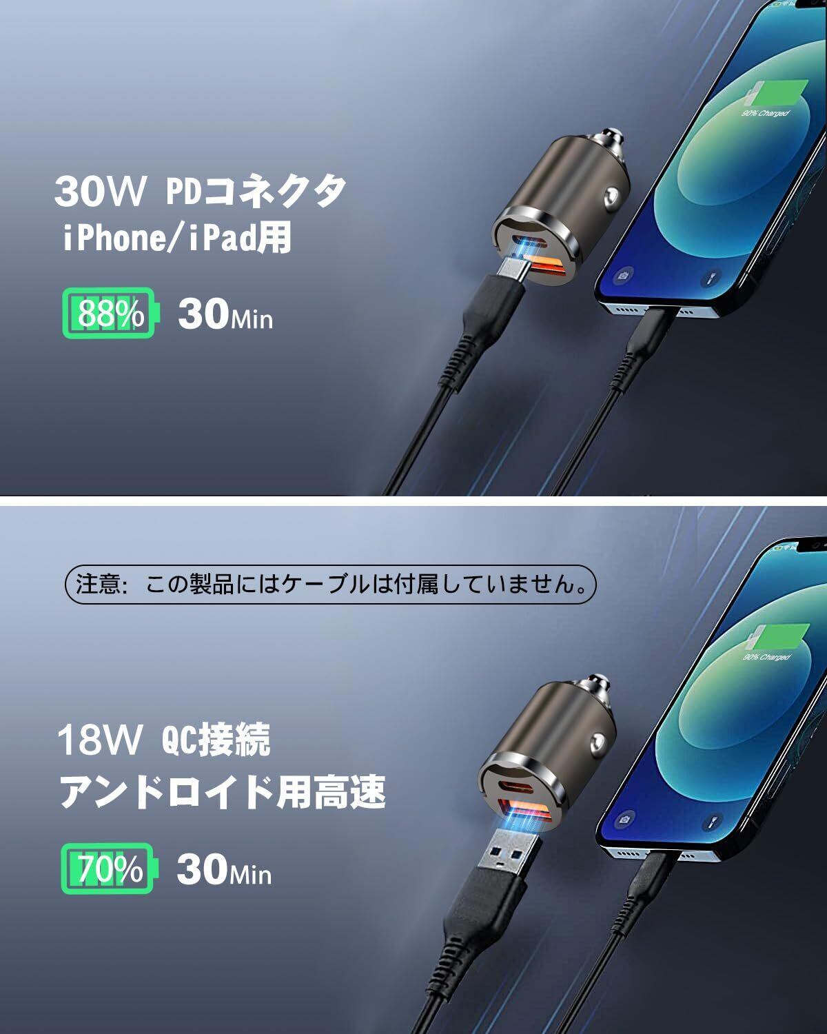 【極小サイズ】このカーチャージャーは超小型設計で親指のようサイズです。なシガーソケット usb-C +USB A、洗練されたデザインと先端技術を融合させ、あらゆる車種に完璧に適合します。スペースを最小限にし、運転操作や車内装備に邪魔ずにご使用いただけます。軽くて頑丈な亜鉛合金が採用されて、プラスチック製のものより熱を放散しやすく、安全性がもっと優れています。