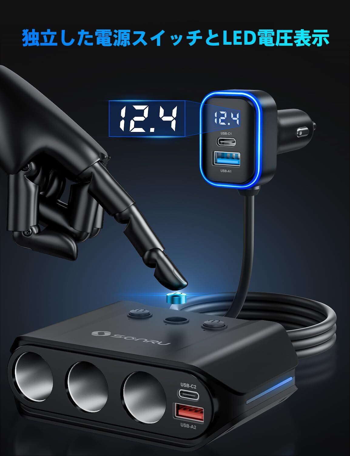 独立した電源スイッチ& LED 電圧表示:このシガーソケット3連、カー チャージャーには、シガレット ライター ソケットをそれぞれ制御する 3 つの独立したスイッチが装備されており、シガレット ライター デバイスのプラグを差し込んだり抜いたりする必要がありません。摩耗を減らし、機器の寿命を延ばします。SONRU シガレット ライター USB チャージャーには、車内の電圧出力をリアルタイムで監視できるインテリジェントな LED ディスプレイが付いています。車の電圧が 12V を下回ると、運転中に問題が発生するのを防ぐためにデジタル警告が点滅します。