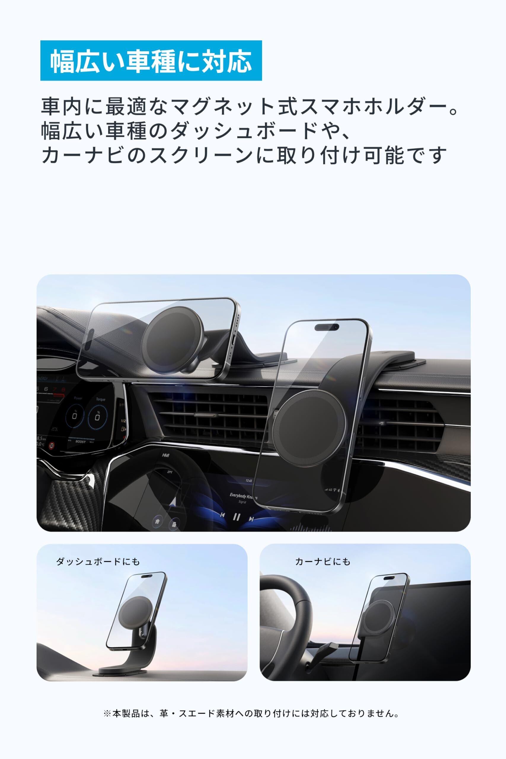 幅広い車種に対応:車内に最適なマグネット式スマホホルダー。幅広い車種のダッシュボードや、カーナビのスクリーンに取り付け可能です。※ワイヤレス充電非対応