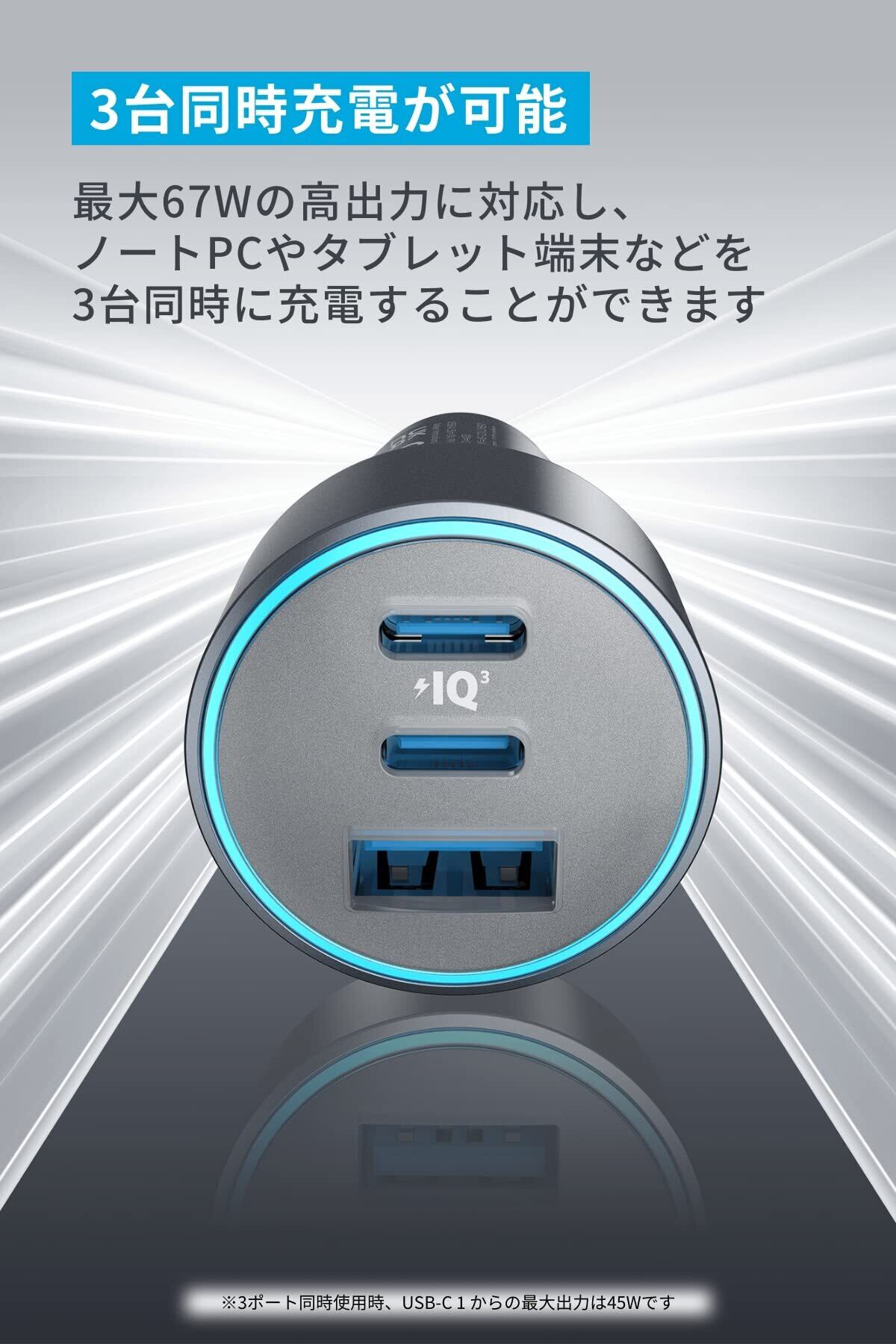 3台同時充電:最大67W出力のUSB-Cポート、最大22.5W出力のUSB-Aポートを搭載。ノートPCやスマートフォン、タブレット端末などの機器を3台同時に充電することができます。