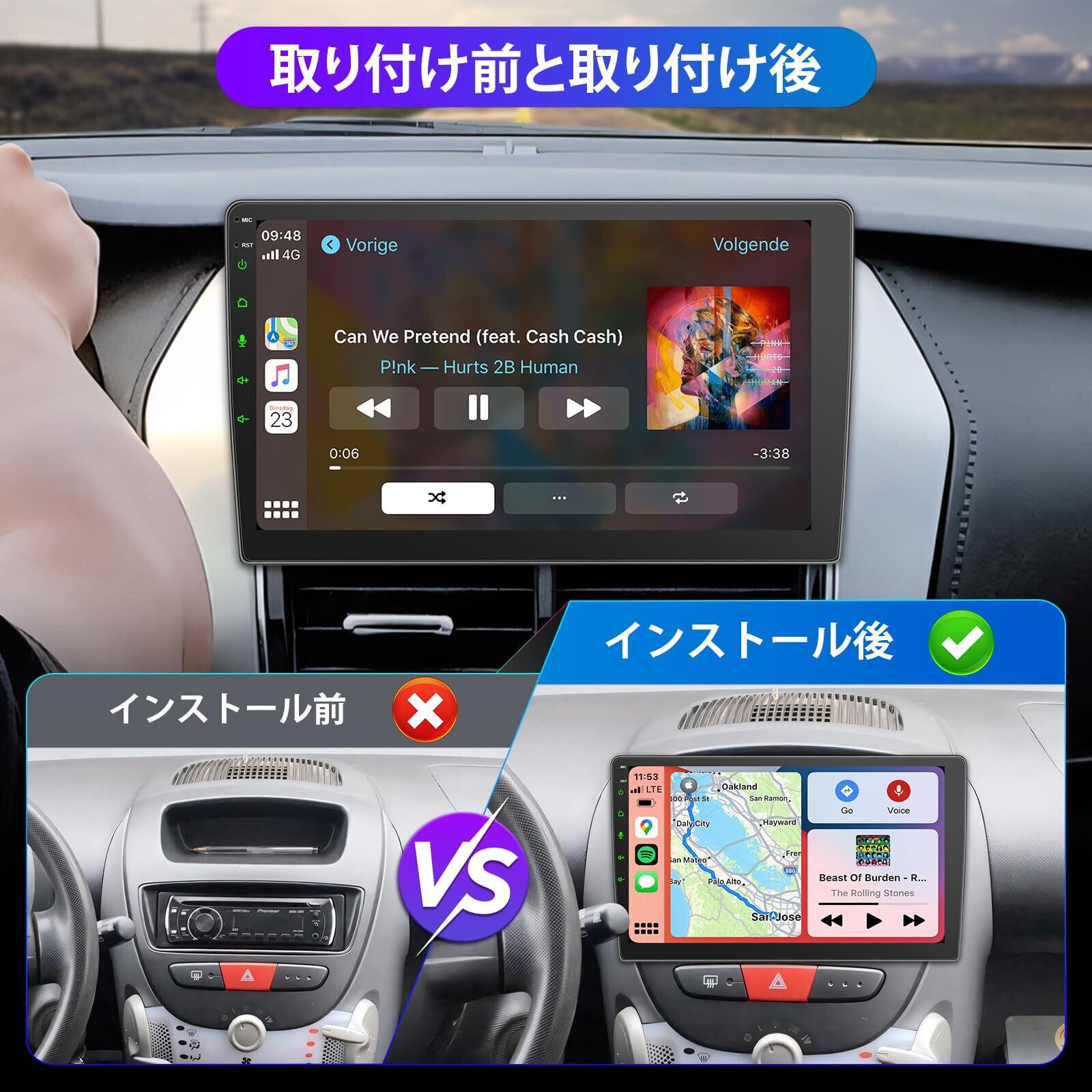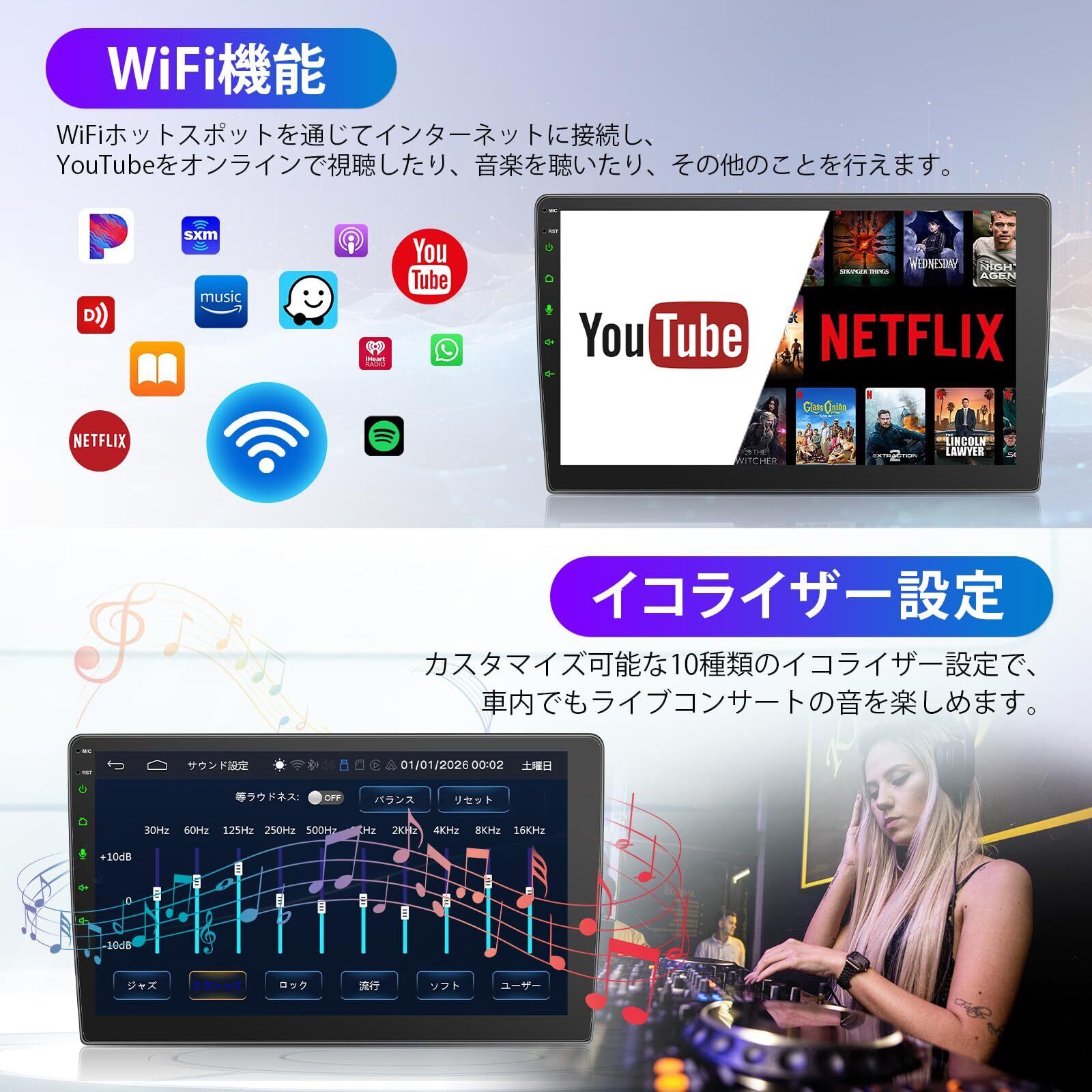 【ワイヤレス&有線CarPlay/AndroidAuto Mirrorlink/AirPlay対応】️当該製品はカーオーディオの必要となる四つ機能が搭載して、従来の有線接続のみ型を突破し、ワイヤレス&有線まで進化しました。煩雑な配線という悩みから解放、スマホ側で接続操作をし接続したら、ナビゲーションや音楽再生、通話等のアプリを使用できます。無線接続なので車内のスペースも見た目はスッキリ、煩雑な配線に左右されなく運転の集中力も散らず、それに音楽アシスタントを使用したら、ナビ目的地の設定や曲の取り替えもわざわざハンドルから離れずに完成し、安全性が向上しております。️無線でミーラリングを使用することで携帯側での画面を10インチ大画面に映り、事前スマホにダウンロードされた動画や映画、Youtobe、 Music、Googleマップなどアプリも対応しており、より多彩なカーライフを提供することができます。「ご注意:NetflixやYoutobeの一部動画は著作権保護のため、ミラーリング視聴での視聴不可の可能性があります。あらかじめご了承ください。」