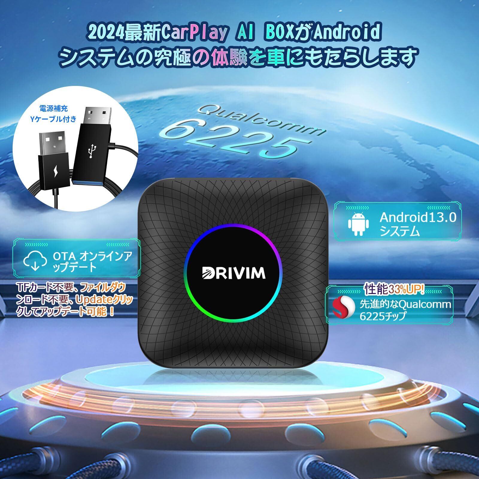 【2024最新DRIVIM LED CarPlay AI Box 】2024最新DRIVIM Android 13.0 CarPlay AI Box発売しました!DRIVIM 最新CarPlay AI Boxは先進的な車用Qualcomm SM6225 8コアのCPUが採用され、以前のSDM450、6125などと比べると、運行速度が33%UP、操作性はサクサクでストレスがありません。【OTA対応】TFカード不要、ファイルダウンロード不要、Updateクリックしてアップデート可能!【グラデーションライト付き】毎日の気持ちと合わせて、違い色が調整でき、車内の雰囲気に折り合います。
