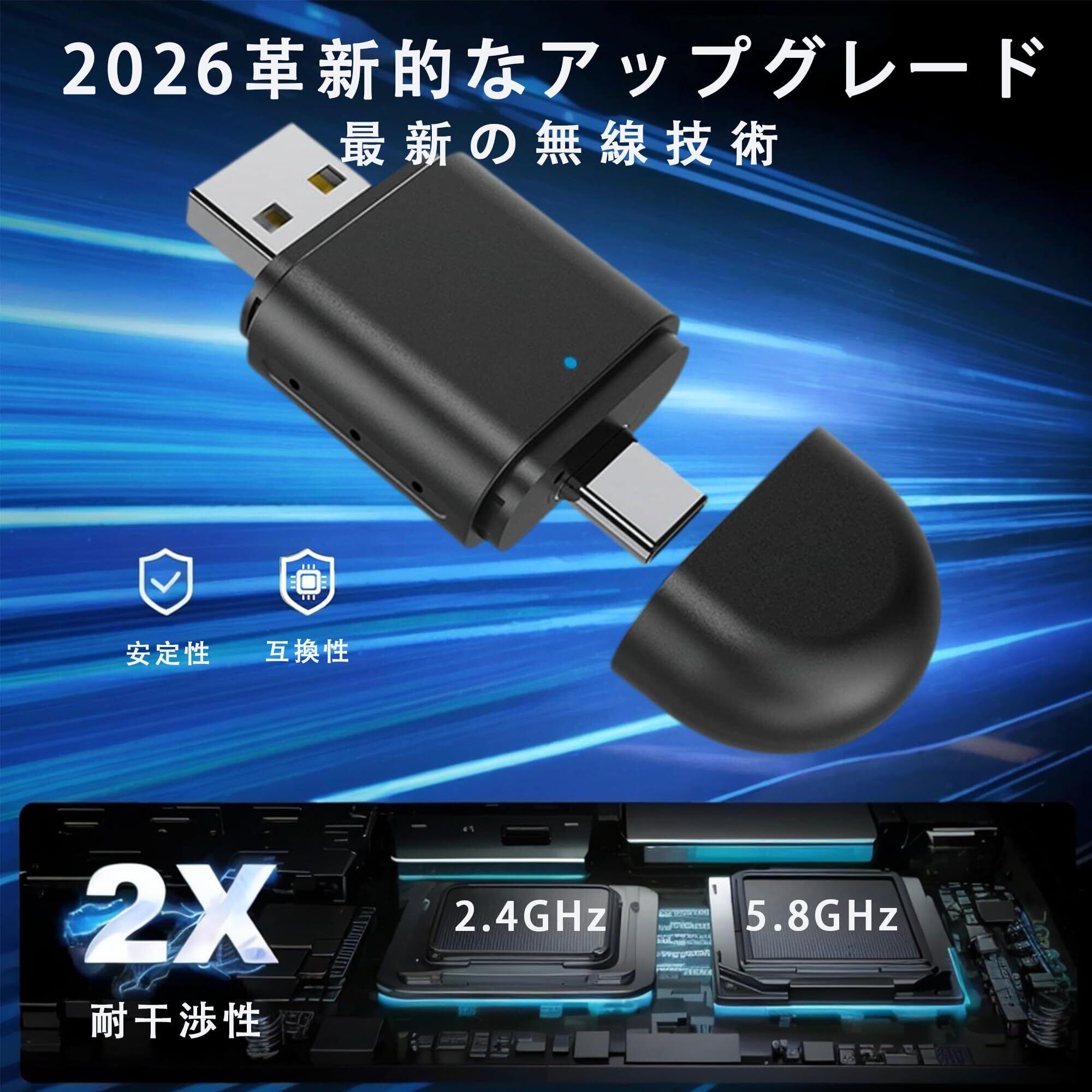 ワイヤレス CarPlay アダプター Android Auto 車載用|USB+Type-C 2in1 有線接続を無線化 | 小型 コンパクト設計| 自動接続 低遅延 GPSナビ Bluetooth 音楽 ハンズフリー通話 |技適認証取得済
