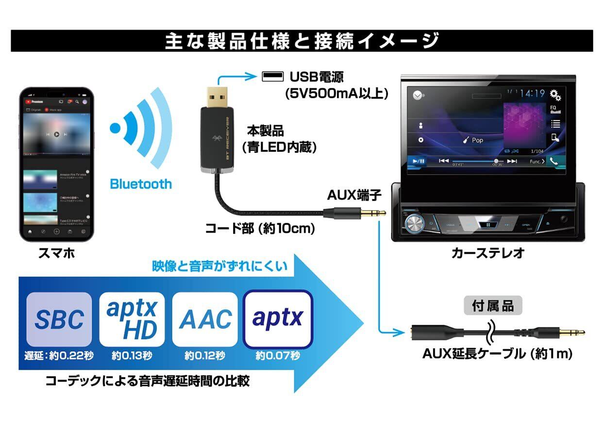 ●Bluetooth対応のスマートフォンや携帯電話の音楽や動画・ワンセグ音声を本製品がワイヤレスで受信し、AUX端子で接続されたカーステレオで聴けます。