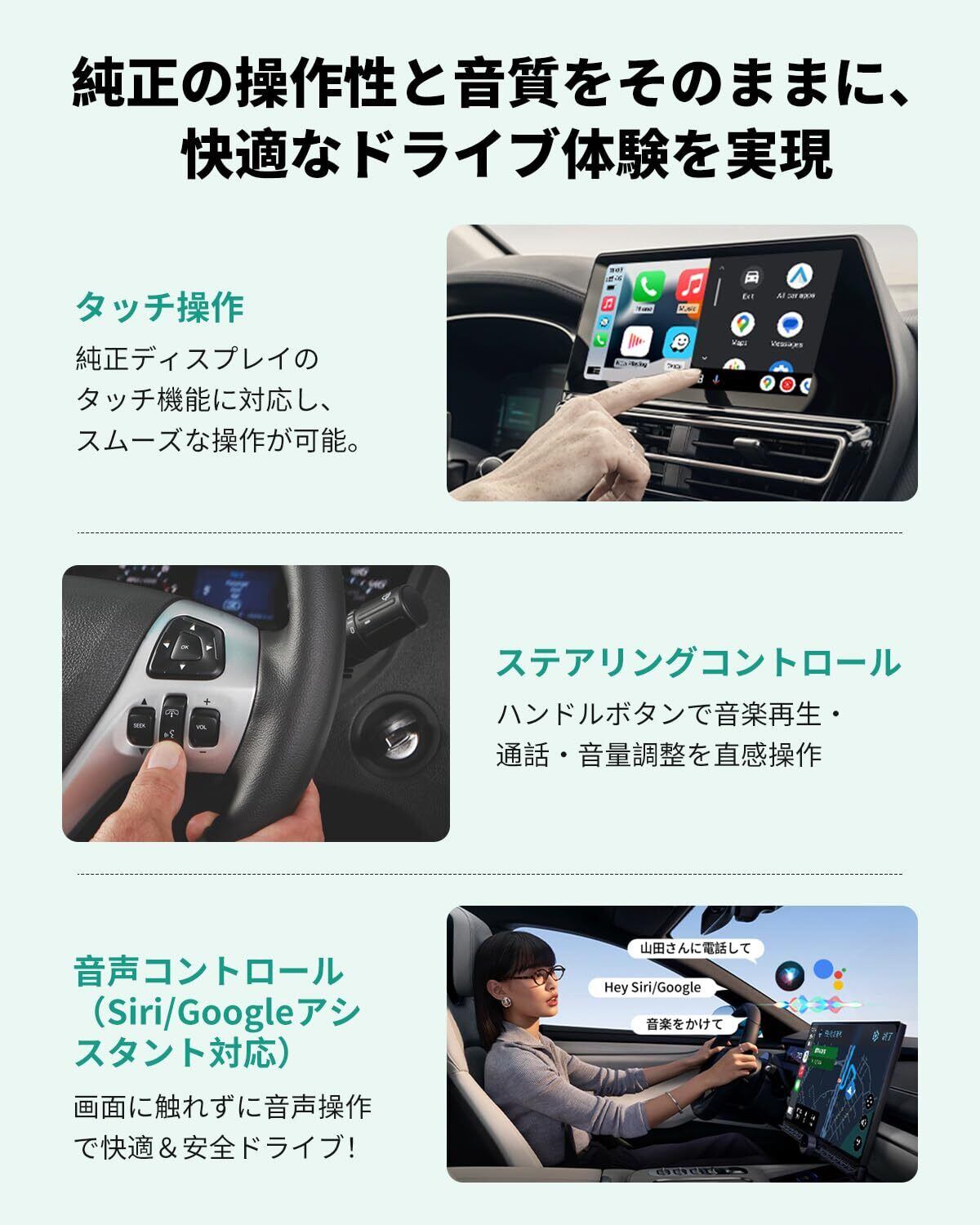 【ご購入前に必ずご確認ください】① 対応車両:2016年以降の純正 有線CarPlay/有線Android Auto 搭載車(USB Type-Cポート専用)・iPhone:iOS 10 以上/Android:Android 11 以上 ② 注意事項:本製品はYouTube/Netflix 等の動画視聴は不可(音声系機能に特化)。・非適用車:BMW/MINI はご使用いただけません。