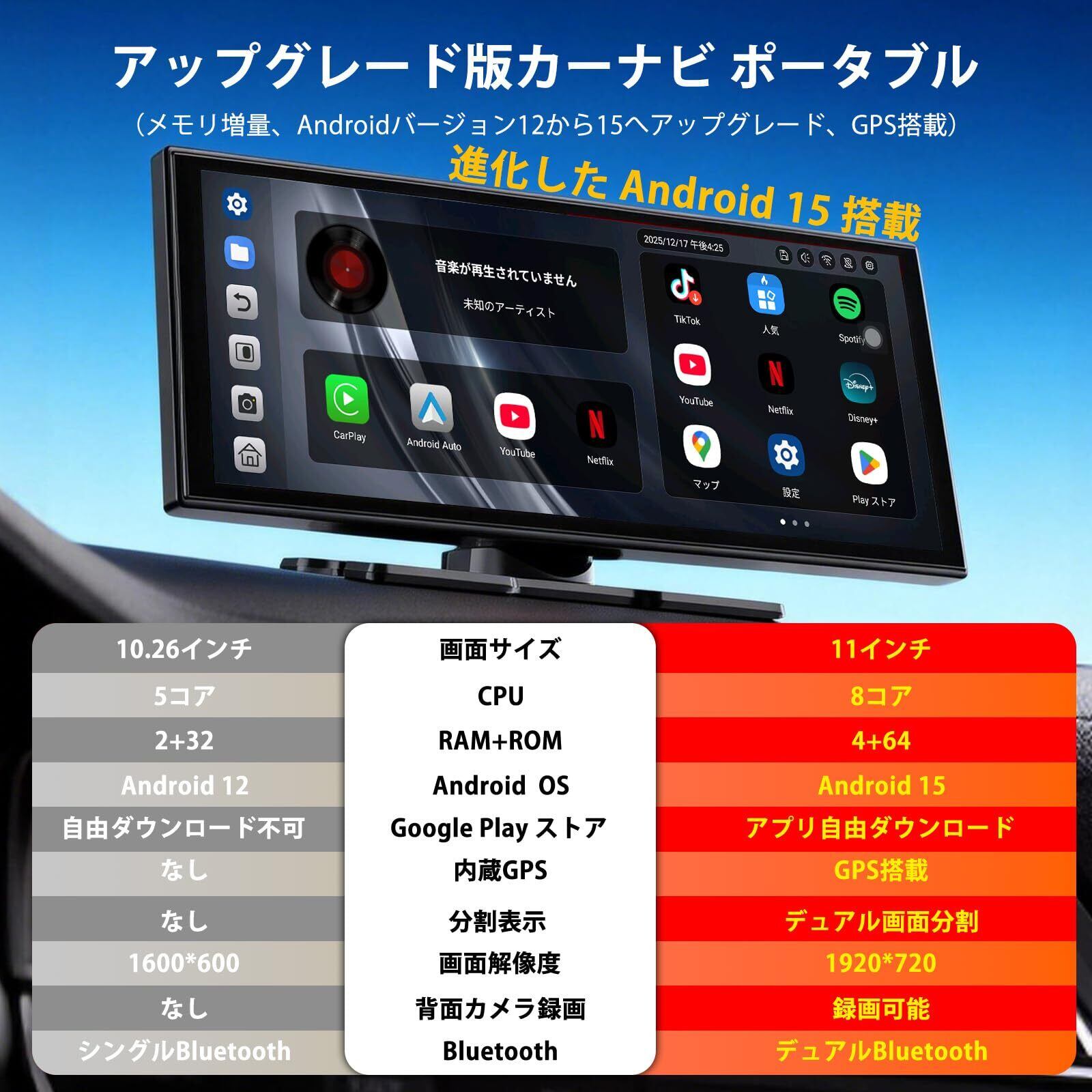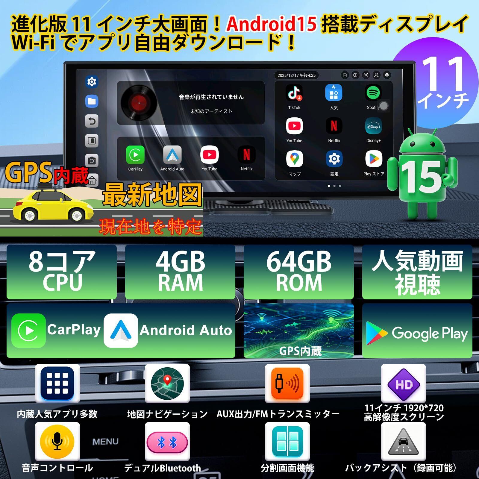 YouTube、TikTok、Netflixなどの人気アプリを自由にダウンロード可能、Android 15システム搭載、8コアCPU、4GB RAM+64GB ROM、CarPlayとAn… 表示を増やす