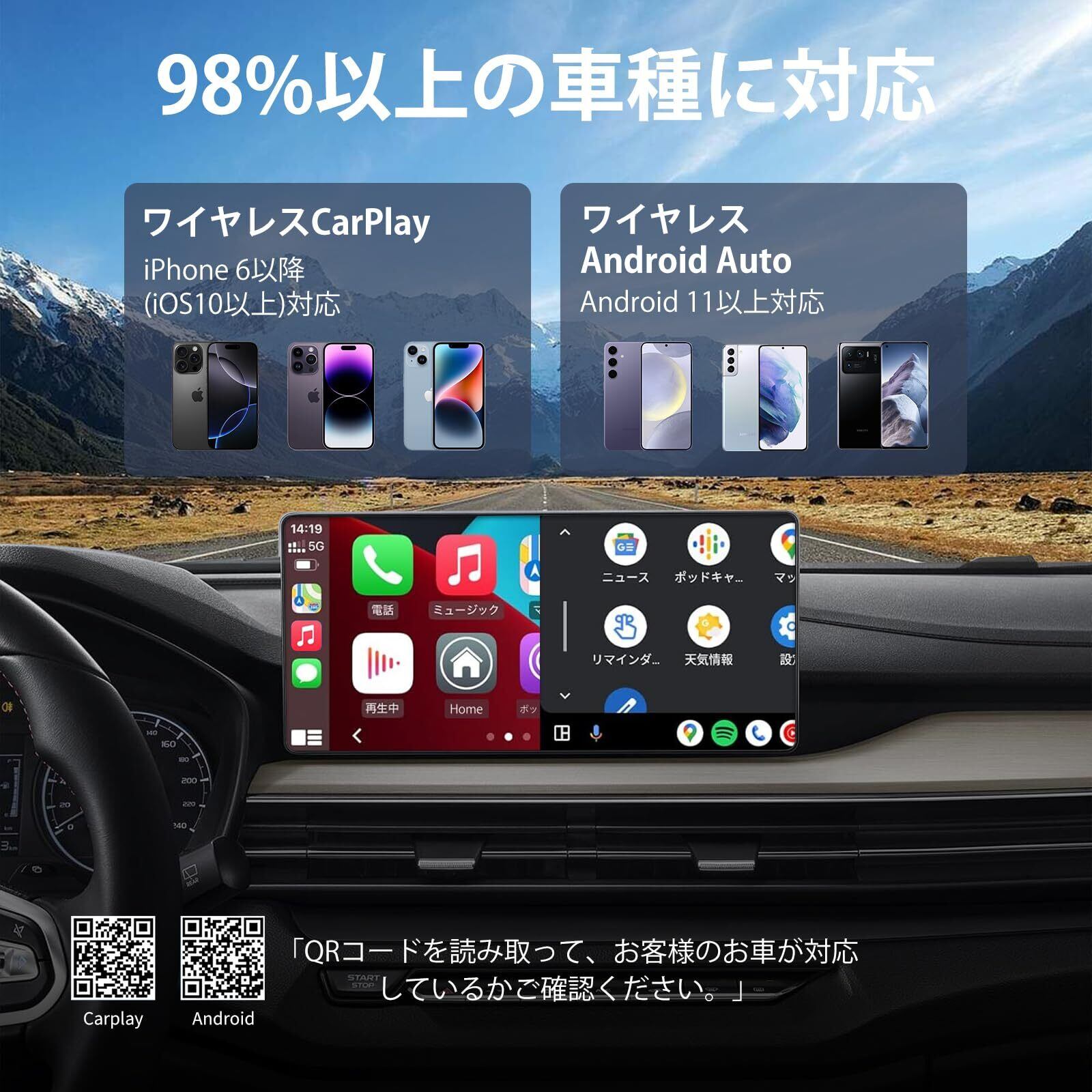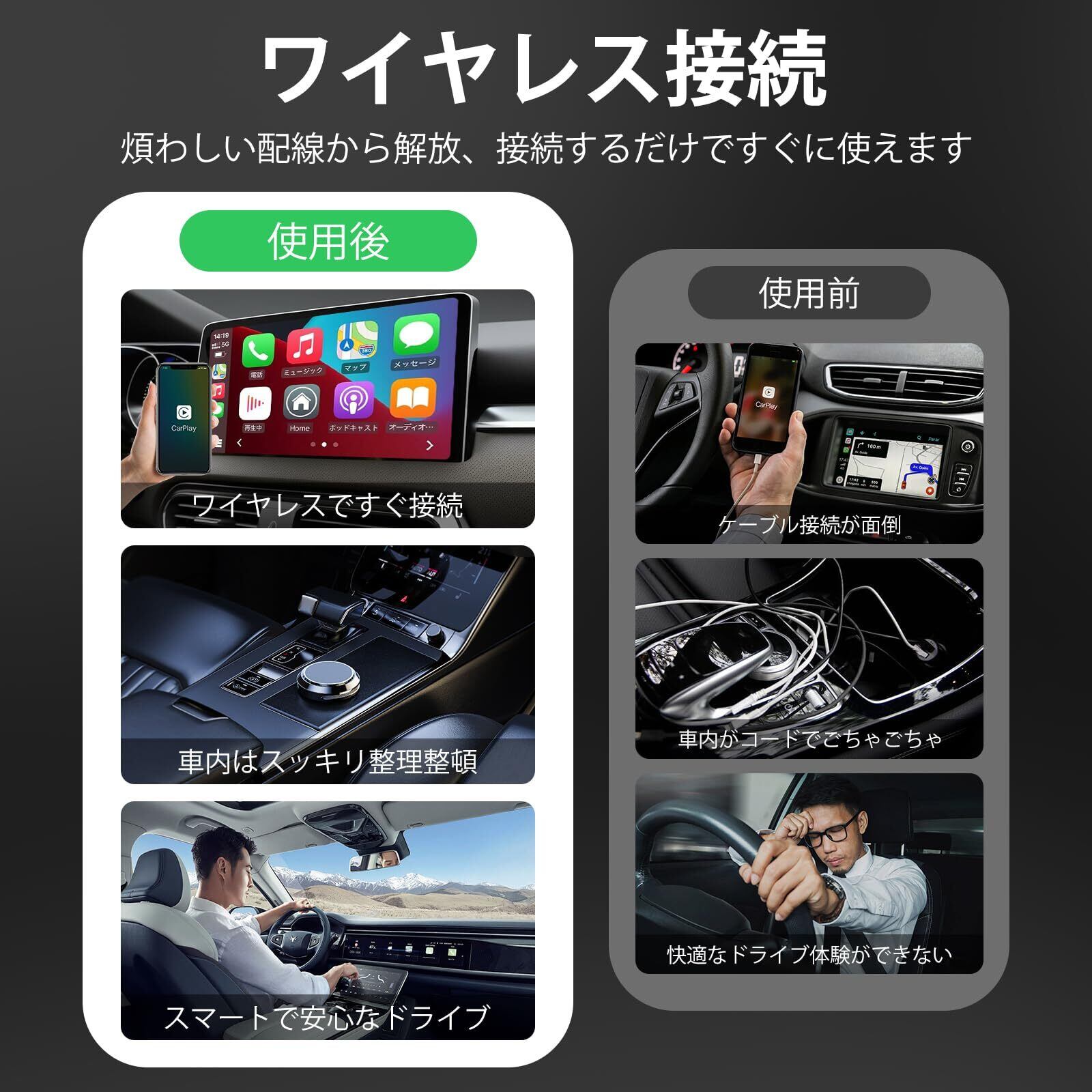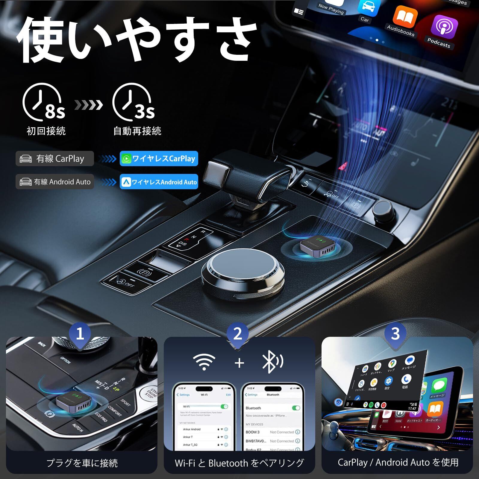 【全シーン対応、スムーズな自動再接続】 iPhone 6以降(iOS 10.0以上)およびAndroid端末(Android 11.0以上)に対応しており、主流スマートフォンの大半をカバーいたします。さらに、2015年以降の純正有線CarPlay搭載車の約98%で動作確認済みです。初回接続後はペアリング情報が暗号化保存され、次回以降はWi-FiとBluetoothをオンにして車を起動するだけで、最短3秒以内に自動的に再接続されます。また、USB-A to Type-C変換アダプターを付属しており、さまざまな車載ポートに柔軟に対応可能です。