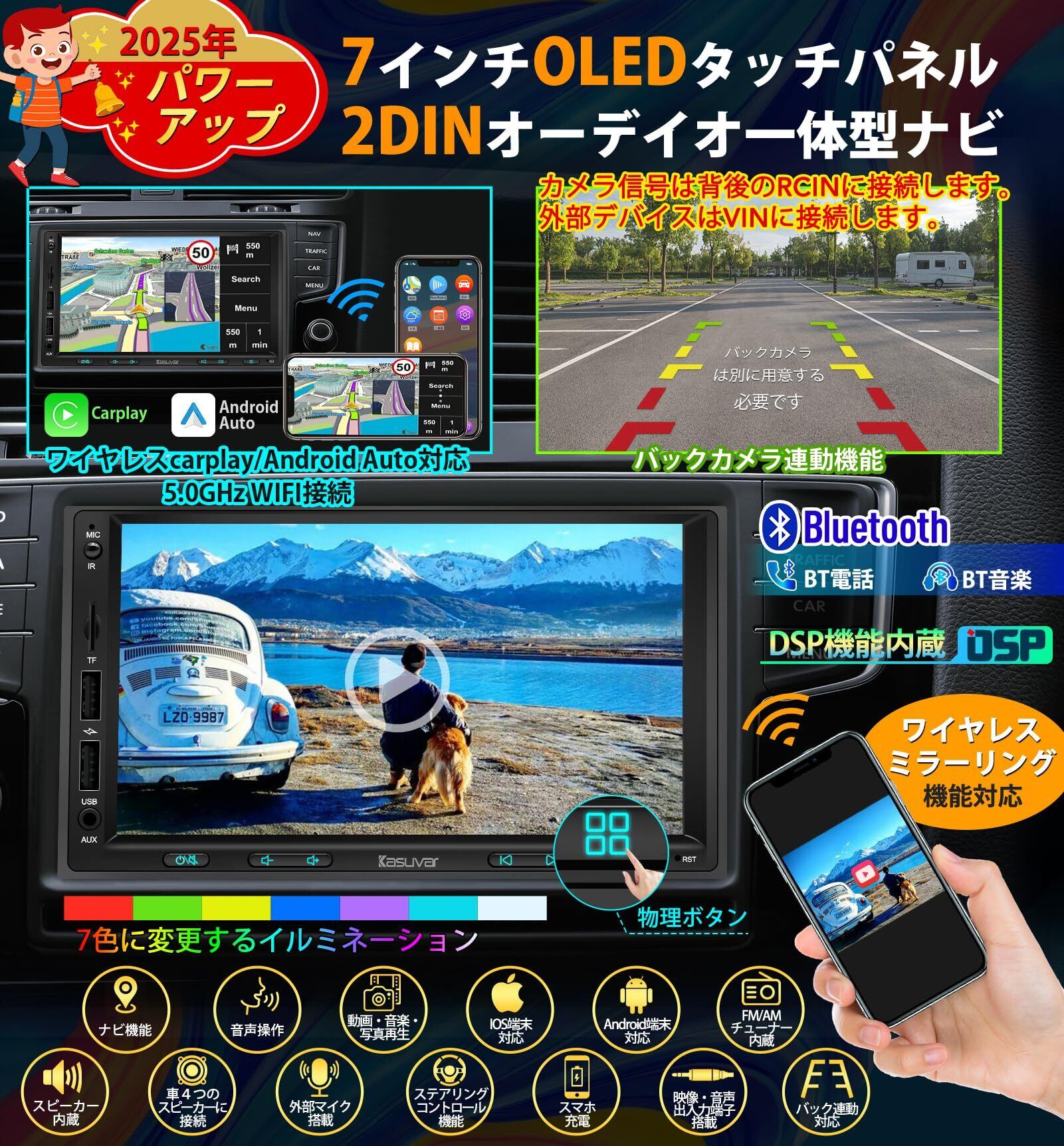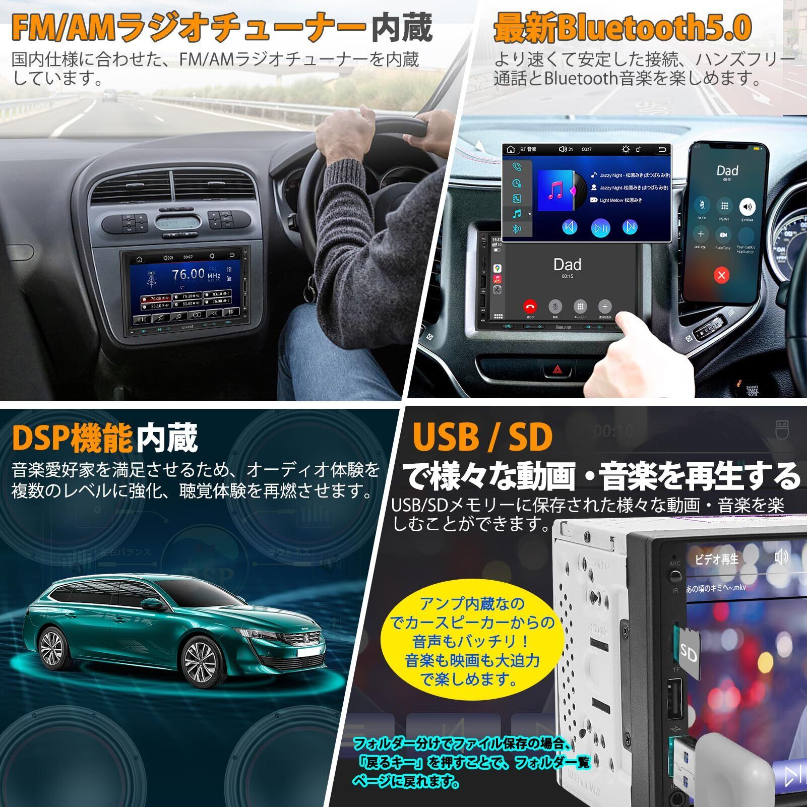 DSP、ワイドFM/AMチューナー、Bluetooth5.0, バックカメラ連動、ステアリング制御、RCA映像・音声出入力, 有線・無線AppleCarPlay、Airplay、AndroidAuto、Mirrorlink