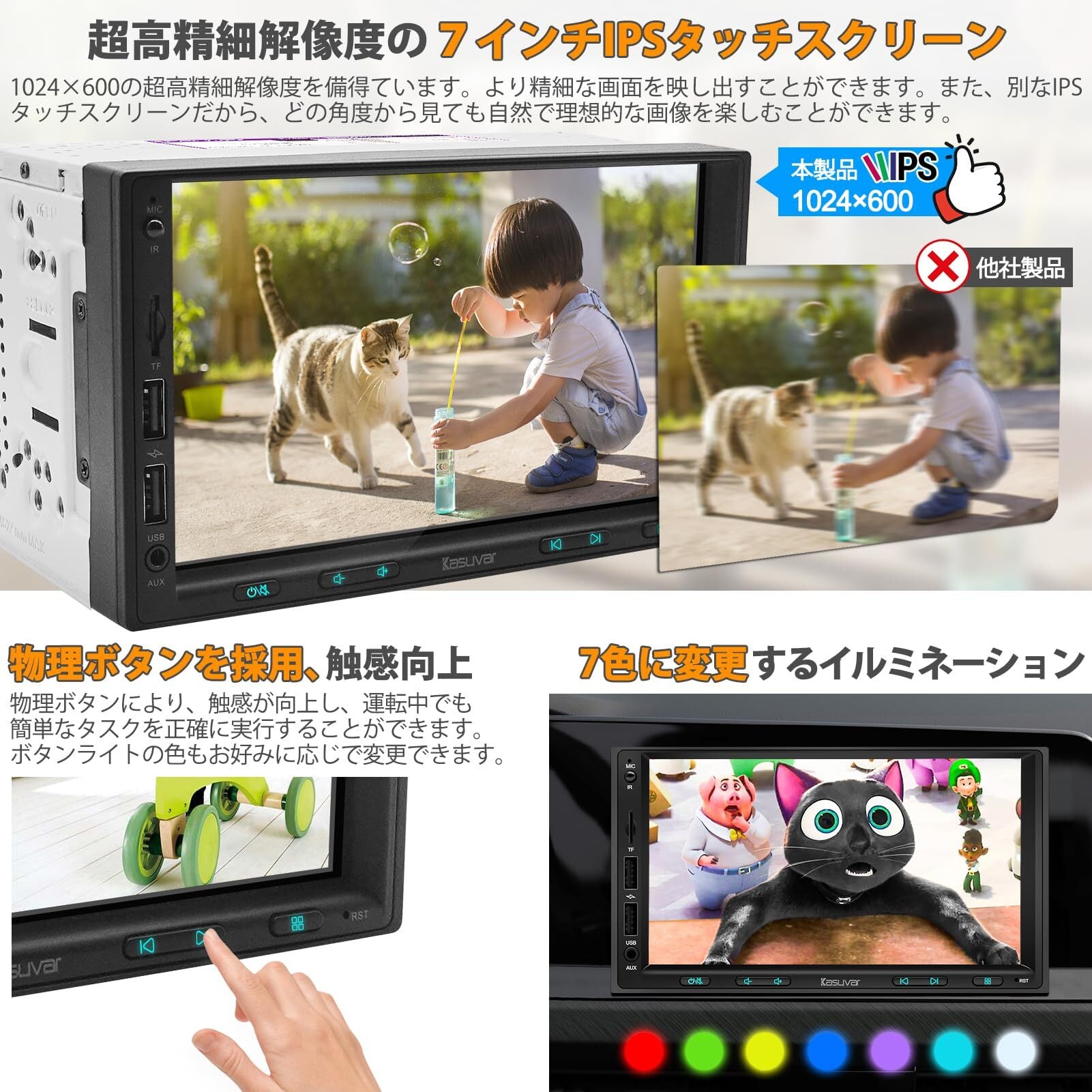 【 バック連動!アンプ内蔵!EQ設定】●バックギアに入れると自動的にカメラ画面に切り替わる機能が搭載されています。●7型1024×600ピクセルの高精細液晶を採用し、細部までクッキリと表示されます。また、IPSパネルを採用しているため、広視野角で斜めからの視聴でも問題ありません。7インチ静電式タッチパネルを採用しており、操作性も優れています。●物理ボタンを採用することで、触感向上と操作のしやすさを実現しています。●強力なDSPチューニングシステムを内蔵し、イコライザー設定で高音質を一緒に楽しもう!