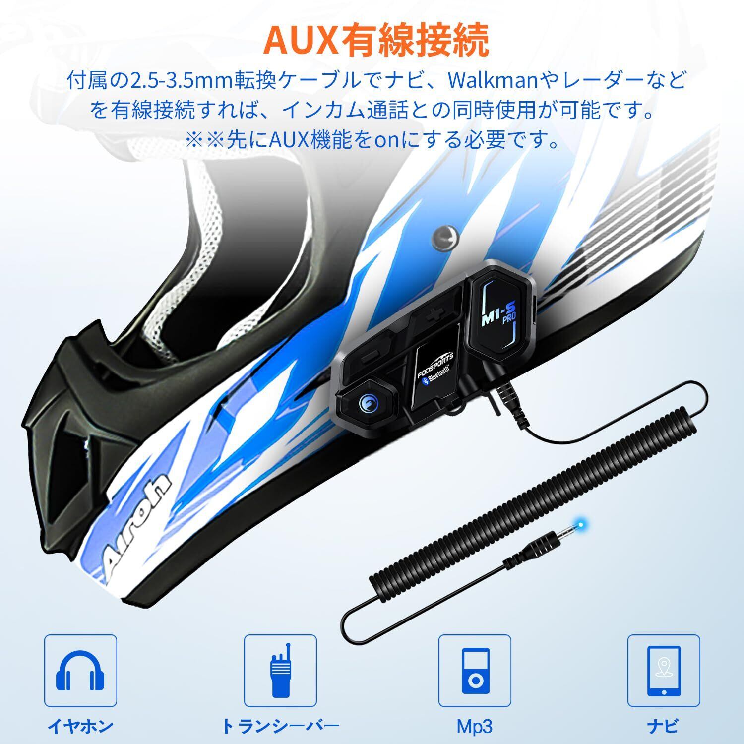 【カッコイイデザイン】ヘルメットによく合うデザインで、そして音量調整及び各種ボタンが使いやすい位置に配置されて、インカムデビューのライダーにとっても、グローブをしたままでも各スイッチの操作も簡単ですが、とても安全です!【AUX有線接続】2.5-3.5mmケーブルでスピード検知器、ナビ、Walkman、ipod、MP3やレーダーなどを有線接続すれば、インカム通話と音楽、ナビの同時使用が可能です。※※先にAUX機能をonにする必要です。【2種類マイク同梱】本体の重さ(約42g)も軽く、付属するマイクもアームマイクとワイヤーマイクが両方同梱していますので、フルフェイスヘルやジェットヘルなど多種多様なヘルメットに取付けが可能です。めちゃくちゃ便利です!