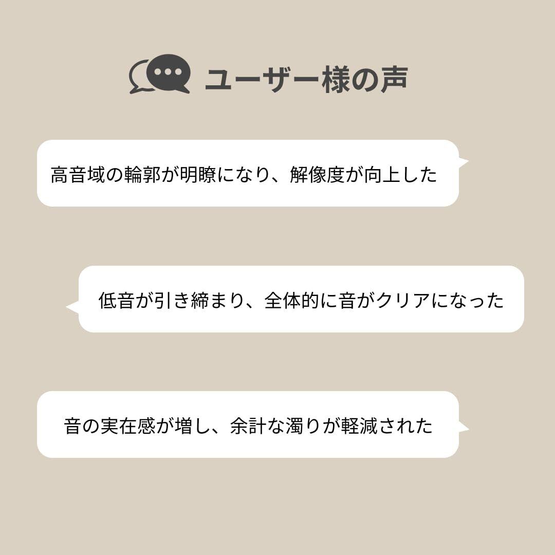 本製品は、音の輪郭や定位感など、微細な音質の変化を追求するためのチューニング用アイテムです。音に対する感受性やご使用環境により、変化の感じ方には個人差があります。劇的な変化をお求めの方にはご期待に添えない場合がございます。