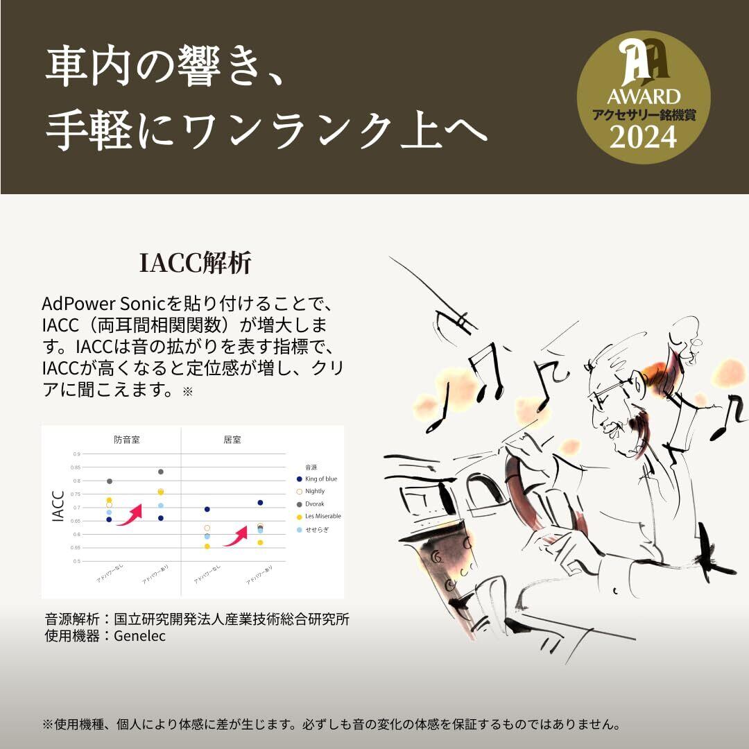 自動車用アドパワーシリーズの静電気抑制効果を応用して誕生したのがアドパワーソニックシリーズです。アドパワーソニックをオーディオ機器に貼り付けることで、ボーカルの声がくっきりとした、音の明瞭度が上がり聞きやすくなったなどのお声をいただいております。国立研究開発法人産業技術総合研究所における音源解析で、AdPower Sonicを貼り付けることで、IACCが増大する傾向があることがわかりました。 ※環境、使用機種、個人により体感に差が生じます。必ずしも音の変化の体感をするものではありません。