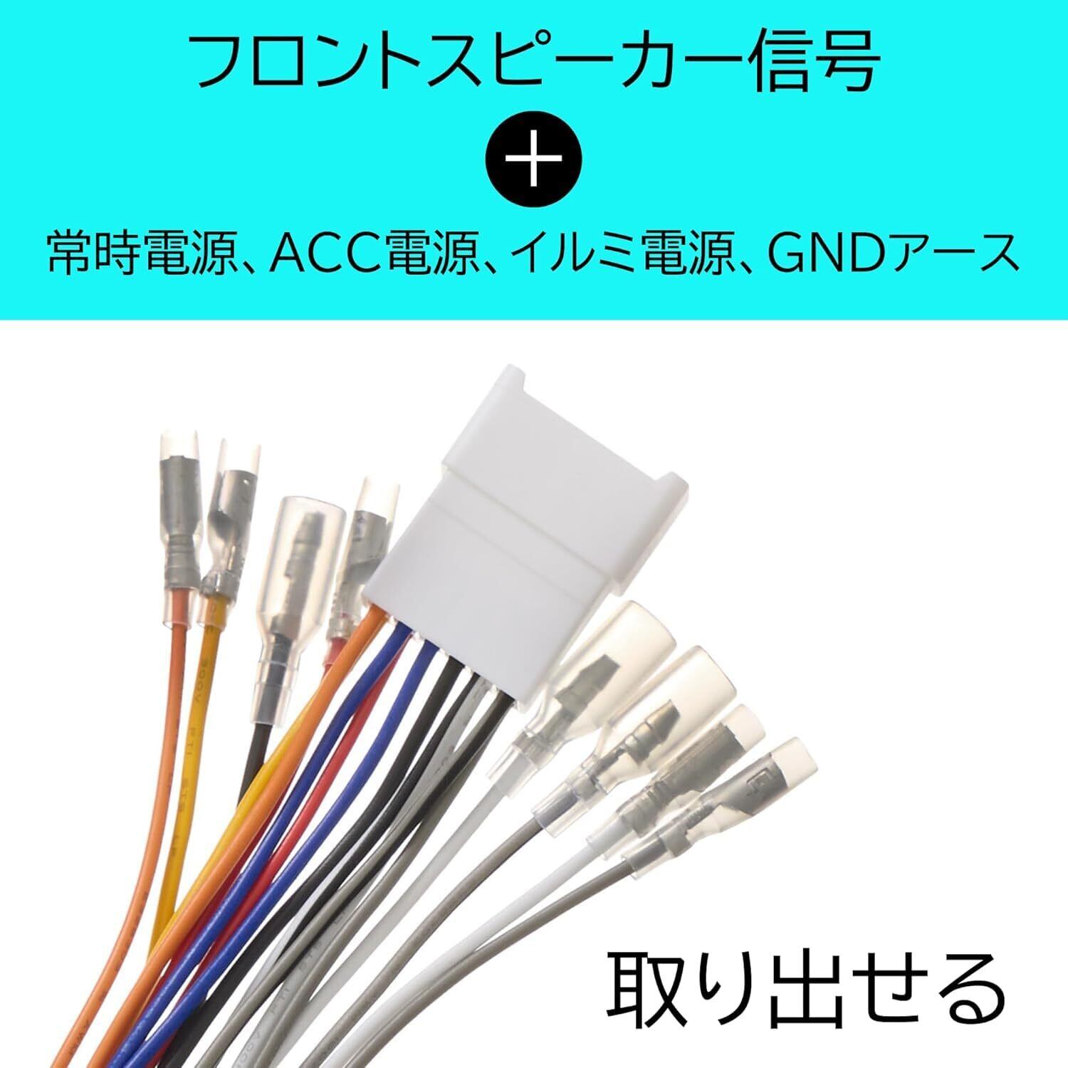 フロントスピーカー出力(L/R)、**常時電源(BAT)/アクセサリー電源(ACC)/アース(GND)/イルミネーション信号(ILL)**の取り出しに対応しています。