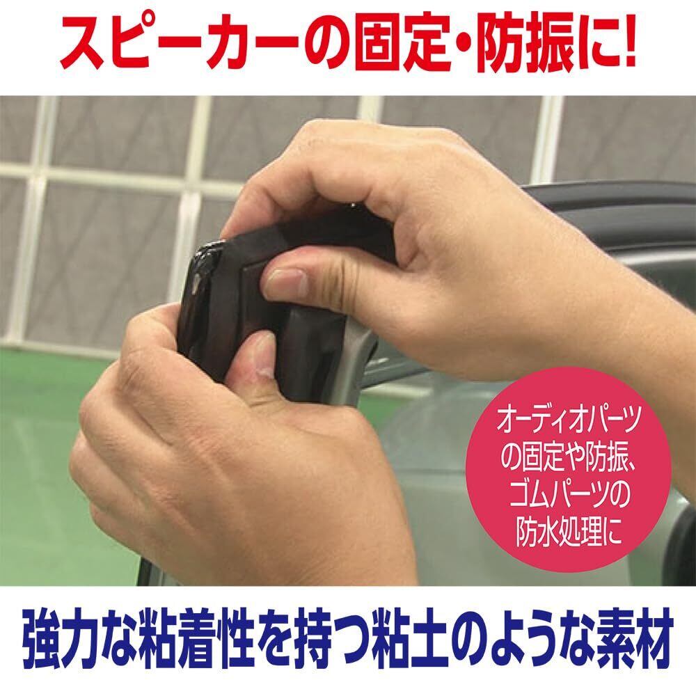 強力粘着、しっかり固定、ピタッと防振。テープの形を変えて、伸び縮みも自在。オーディオ、スピーカーなどの固定やデッドニング(防振)補助剤に。ドア、トランクなどのゴムのはがれ、水漏れ補強、防水処理に。アクセサリーパーツ取り付けの仮止めや補強に。強力な粘着性をもつ粘土のような素材ですので、様々な場所に使用いただけます。