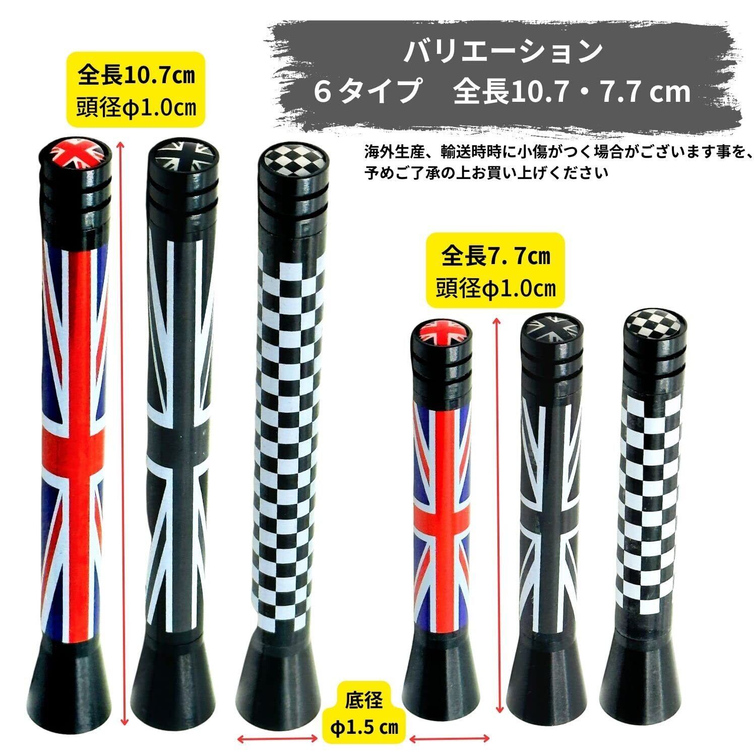 ショートアンテナの種類も豊富、デザインはユニオンジャック/グレーユニオン/チェッカーフラッグ、全長は7.7㎝/10.7㎝の6種類をご用意いたしました。