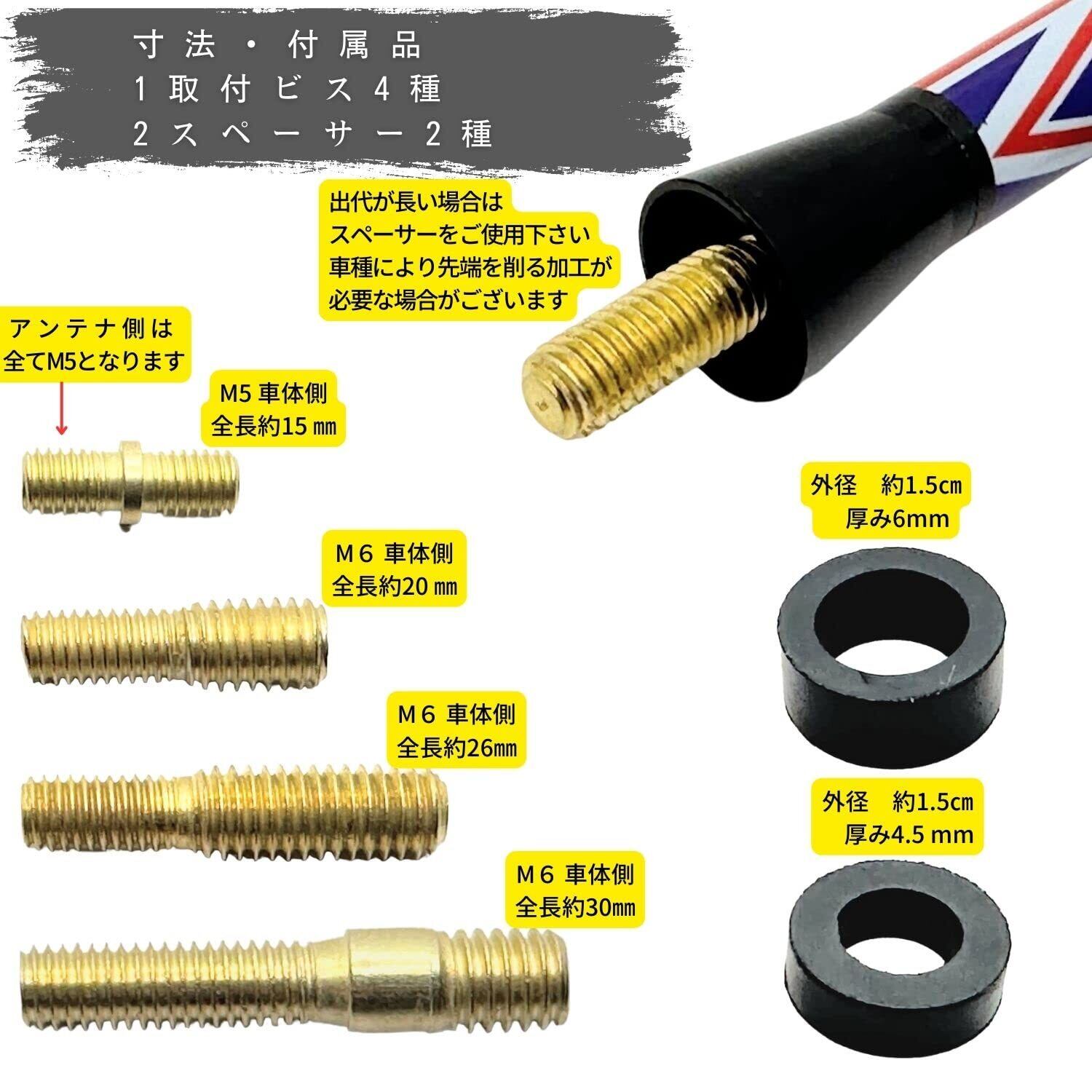 【セット内容】アンテナ本体:1本(全長7.7cm/10.7㎝) スペーサー:2枚(厚み6mm×外径14mm/厚み4mm×外径14mm) ボルト:4個、本体取付側は全てⅯ5(M5全長15mm、M6全長20mm、M6全長26mm、M6全長30mm)